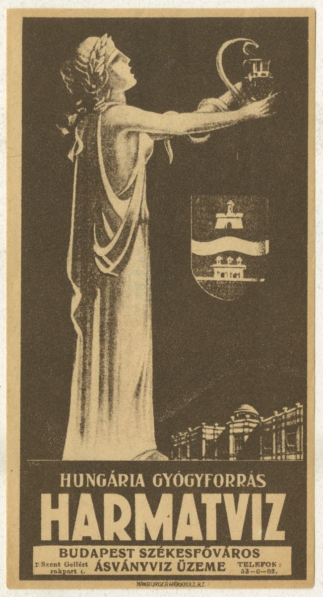 forrásvíz, gyógyvíz, gyógyhatás, nő, koszorú, korsó, gyógyforrás, címer, egészség, reklámnyomtatvány, kisnyomtatvány, aprónyomtatvány, számolócédula