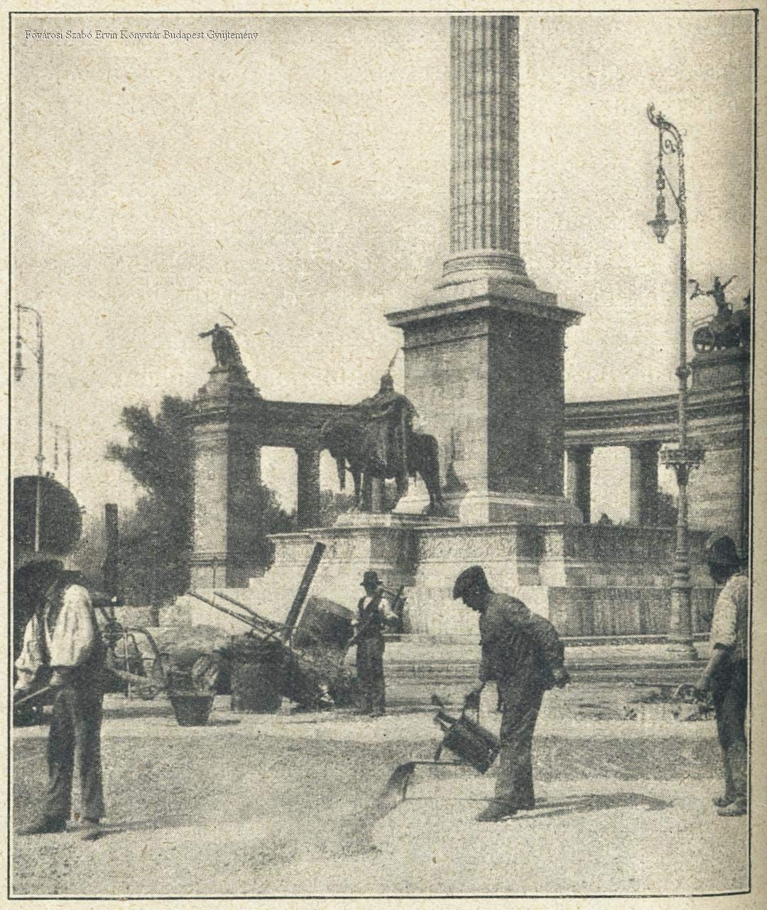 városkép, tavasz, munkás, fizikai munka, park, útburkolat, 1913