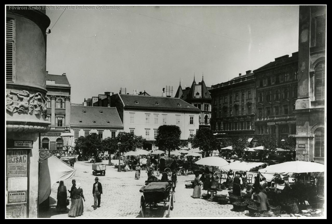 Népes piaci jelenet, sátrak, kosarak, kofák, parasztok, vásárlók. A felvétel a piarista rendház és a városháza felől a Kötő és Váci utca irányában készült. Színházi előadás és sajtóplakát