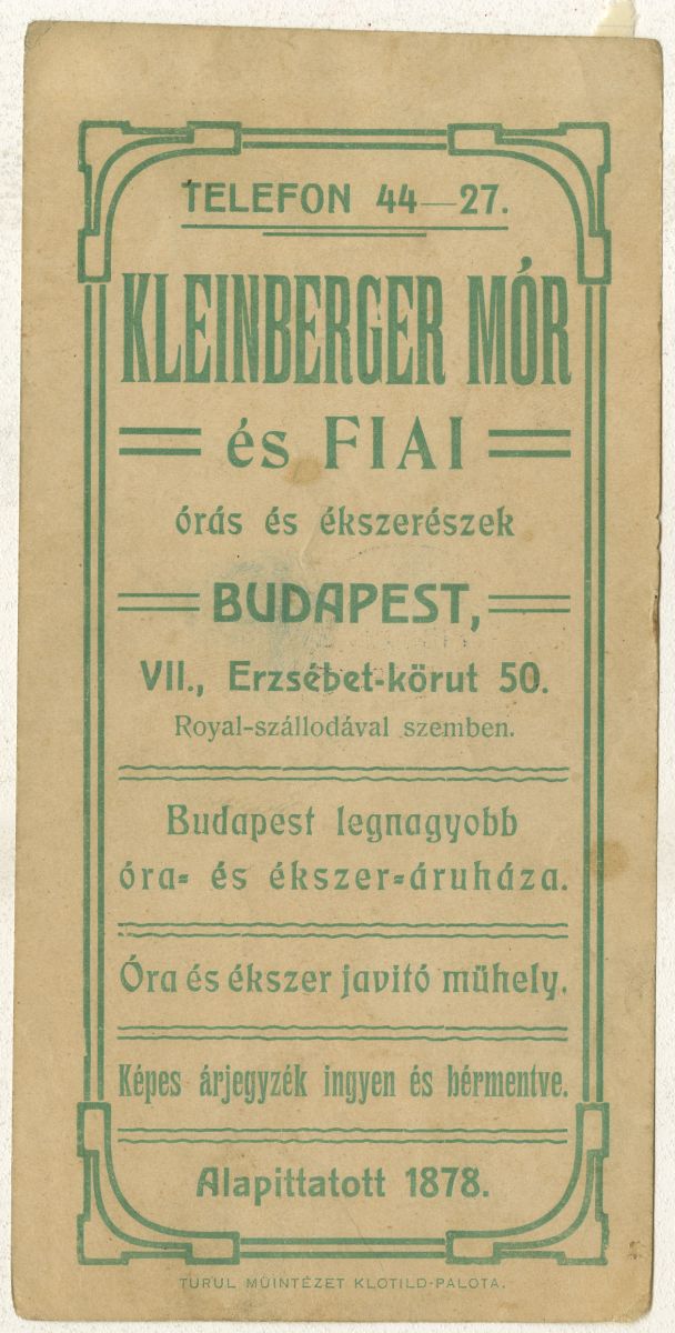 Kleinberger Mór és Fiai órás és ékszerészek. Budapest, VII. Erzsébet körút 50. Royal szállodával szemben.