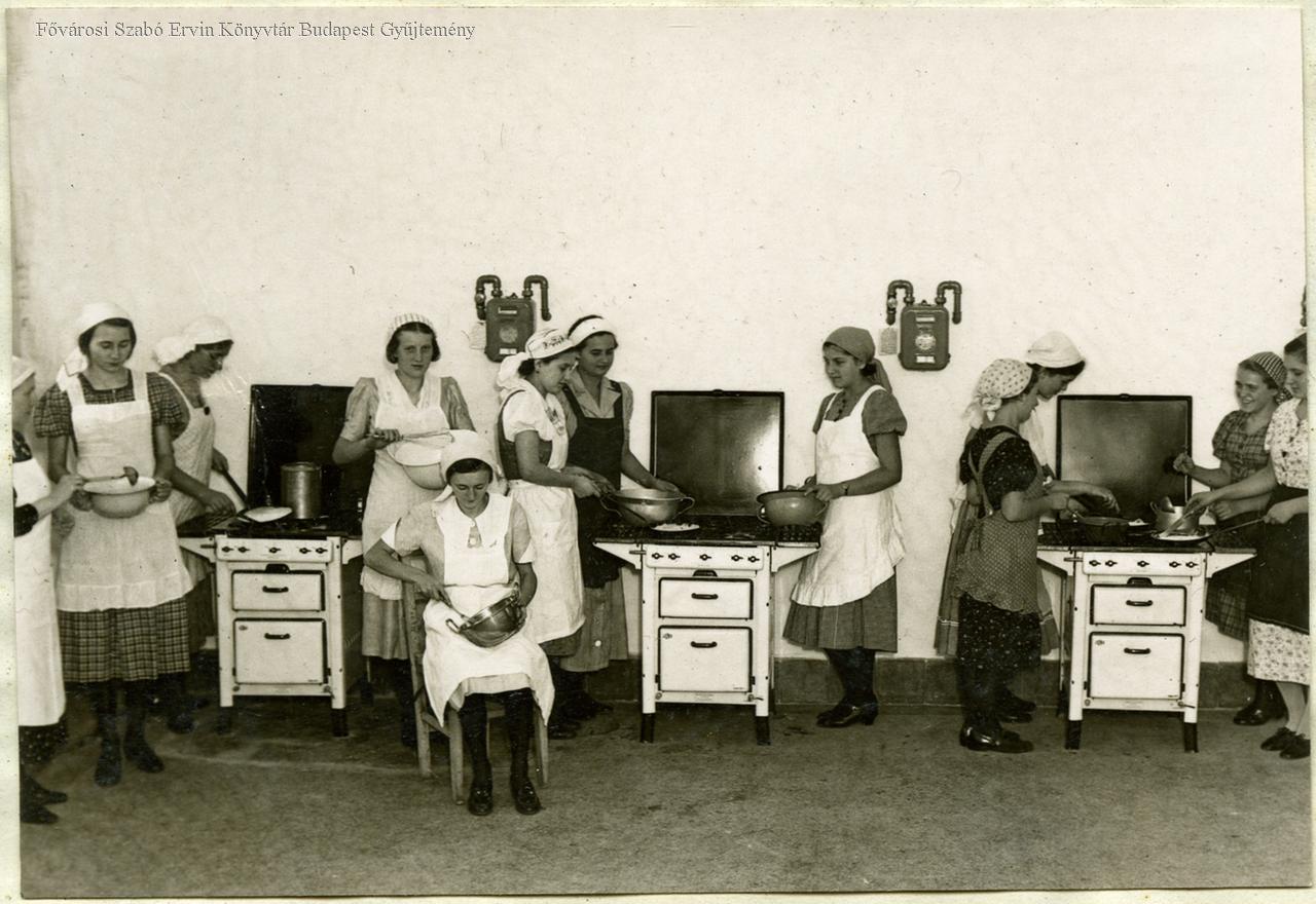 [A budapesti Ranolder Intézeti Klára Nőipari és Háztartási Felső Leányiskola; főzés a tanórán]