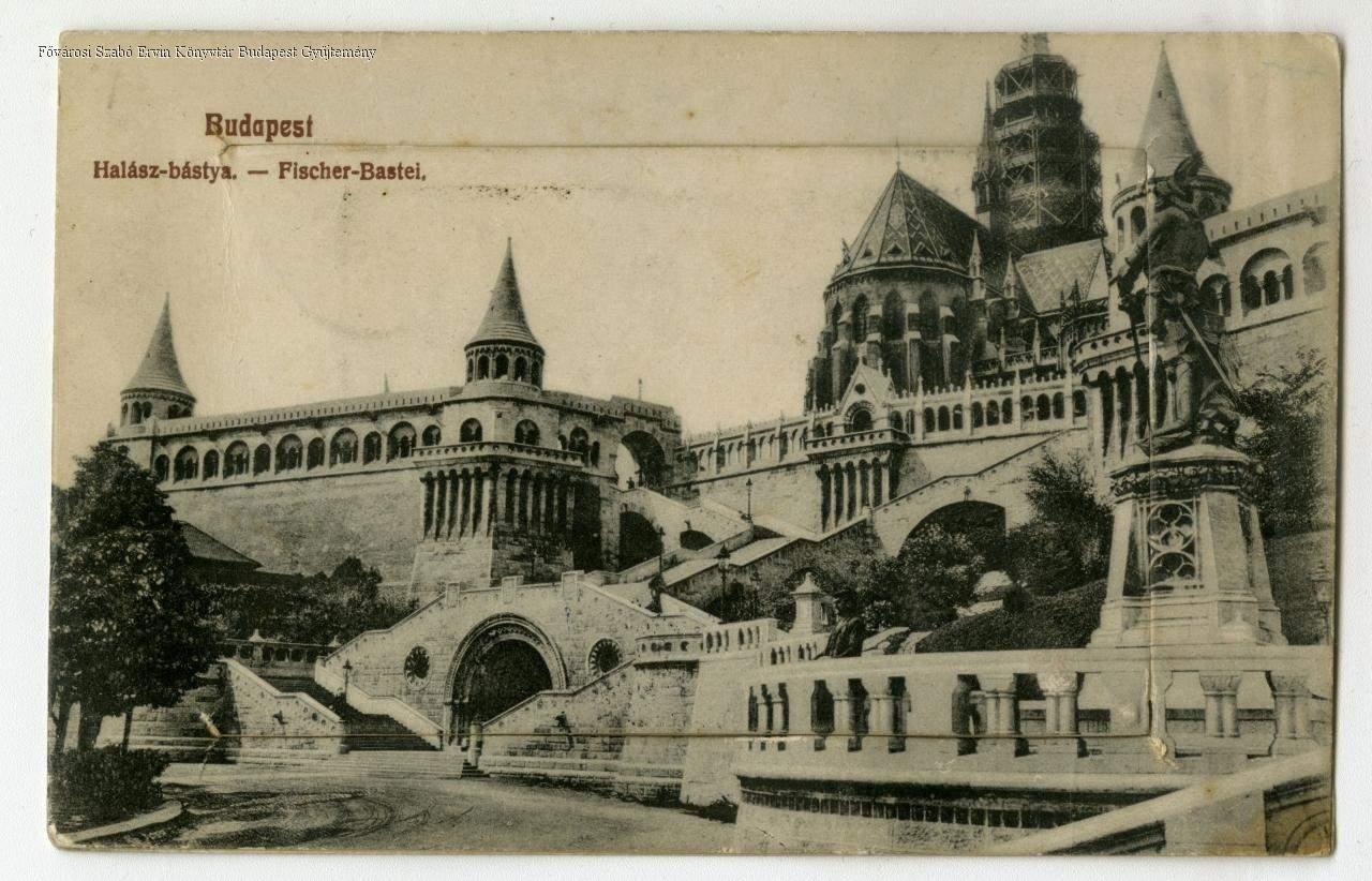 A Halászbástya a Várban, felette a Budavári Nagyboldogasszony-templom, jobbra Hunyadi János szobra, a felvétel 1896 körül készülhetett