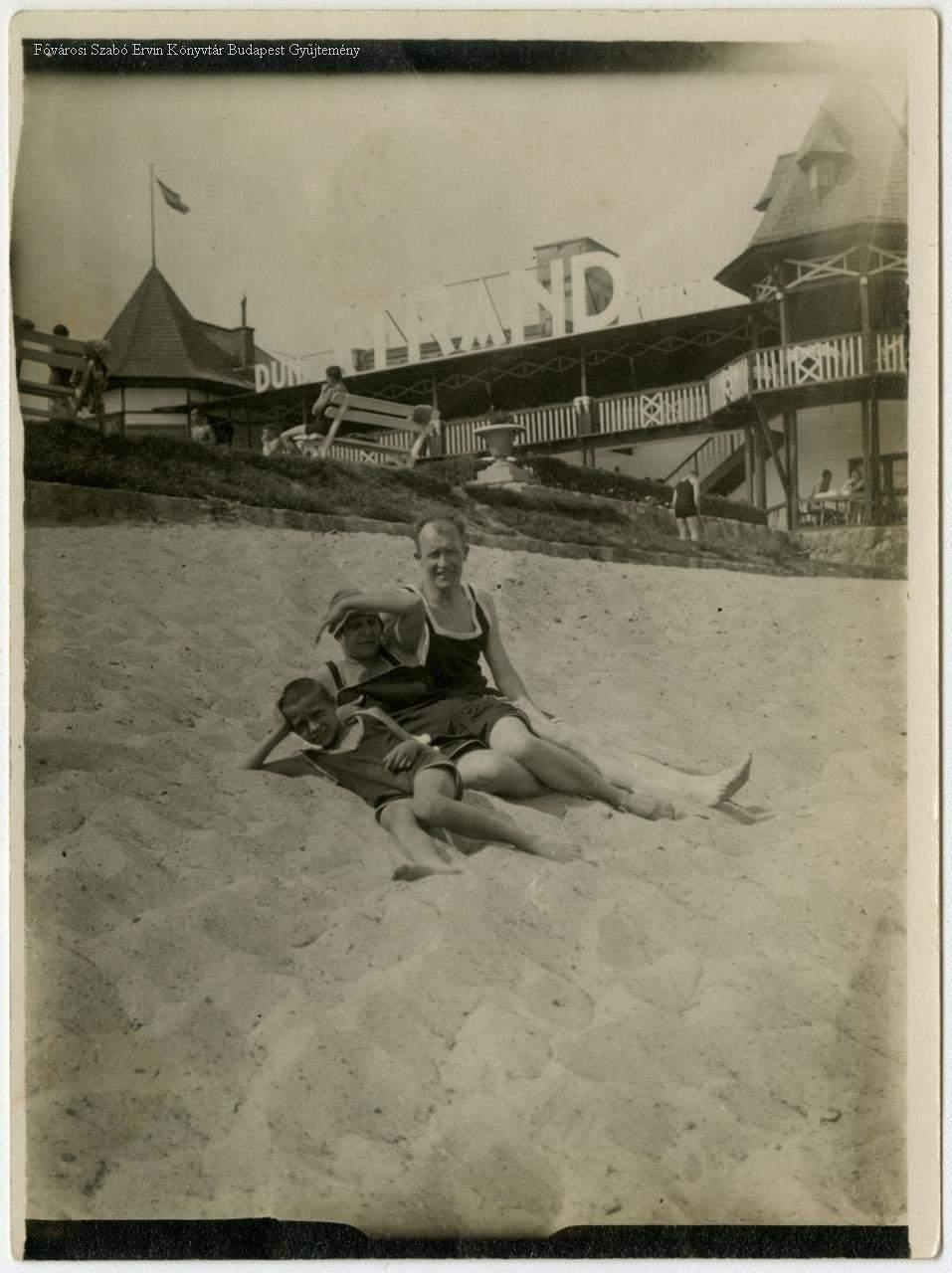 [Homokos parton ülő család a az újlaki Duna strandfürdőben]