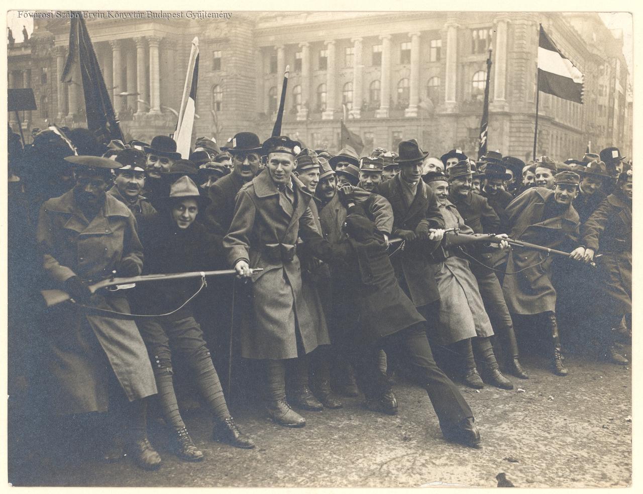 1918-as polgári demokratikus forradalom, utcakép, zászló, néptömeg, katona, puska