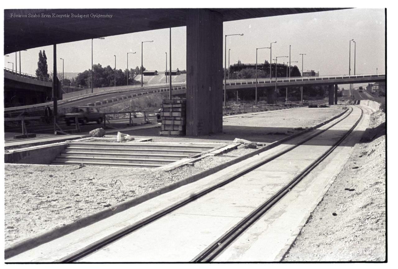 külső felvétel, látkép, épületkép, felüljáró, építés, vasúti sín, vasúti pálya, autóbusz, 1980-as évek