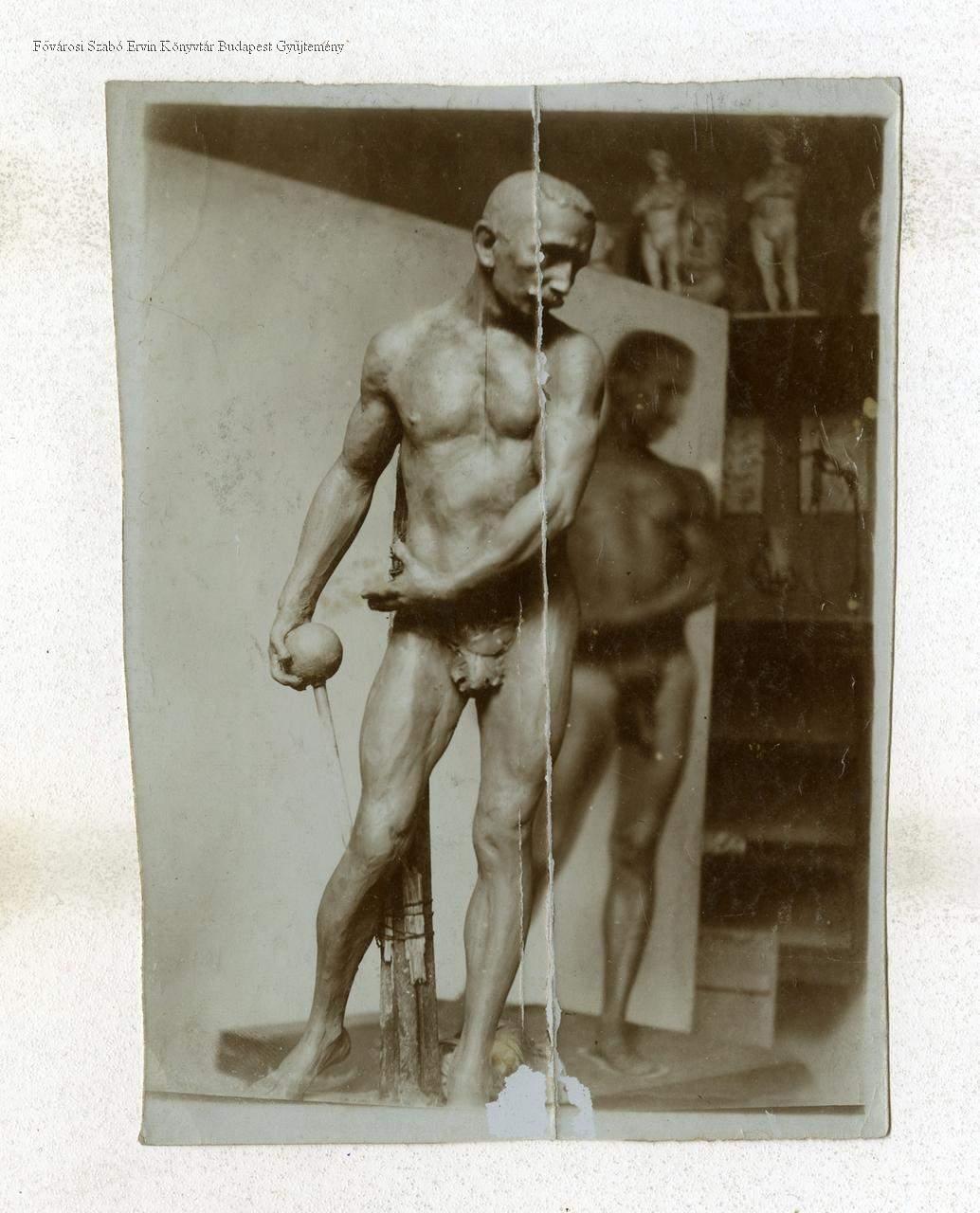 [Zsákodi Csiszér János férfiakt szobra az Országos Magyar Királyi Iparművészeti Iskolában, háttérben a modell, 1903, október 4.]