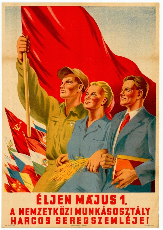 Plakát, színes, propaganda, május 1, kommunizmus, szocializmus, felvonulás, vörös zászló, munkások, búzakalász, Tedesco Anna