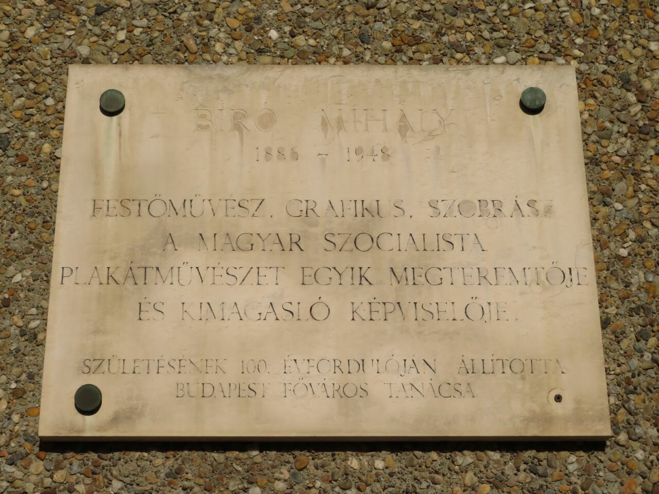 Hol található? Bíró Mihály u. 1. Az emléktábla a Bíró Mihály és a Baross utca kereszteződésénél, az egyik lakóház falán található. Bíró Mihály (1886-1948) festőművész, grafikus, főiskolai tanár volt, könyvtárunk utcájának névadója.Az iparművészet és az alkalmazott grafika különböző műfajaiban tevékenykedett 1910-től. Karikatúrákat, illusztrációkat, ex libriseket rajzolt, használati tárgyakat tervezett, reliefeket és szobrokat készített. Fő alkotóterületévé a plakáttervezés vált, elsősorban az MSZDP politikai agitációjának szolgálatában. Legismertebb plakátja a Vörös kalapácsos ember (1911). A Tanácsköztársaság május 1-jei ünnepi dekorációinak tervezését és kivitelezését irányította, részt vett a fegyveres harcokban. Választási plakátokat tervezett az Osztrák Szociáldemokrata Párt számára (1920 és 1930). Külföldön is sok megrendelést kapott kereskedelmi, sajtó- és filmplakátokra. Berlinben az UFA Filmgyár alkalmazta. Az Országos Magyar Képzőművészeti Főiskola újonnan létesített plakát tanszékének vezetője lett 1919-ben. A Tanácsköztársaság bukása után Bécsbe emigrált, a Bühne c. színházi lap, a Volk und Zeit és a Die Stunde rajzolója, majd Berlinben, Prágában, Párizsban élt. 1947-ben visszatért Magyarországra.