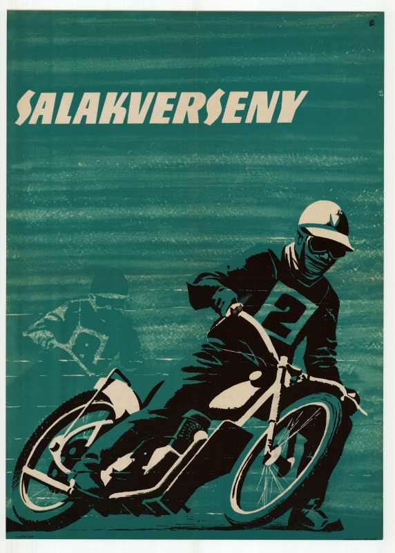 Színes, grafikai plakát egy motoros salakverseny reklámozására. A képen egy versenyző látható motorkerékpárral, dinamikus mozdulat közben.