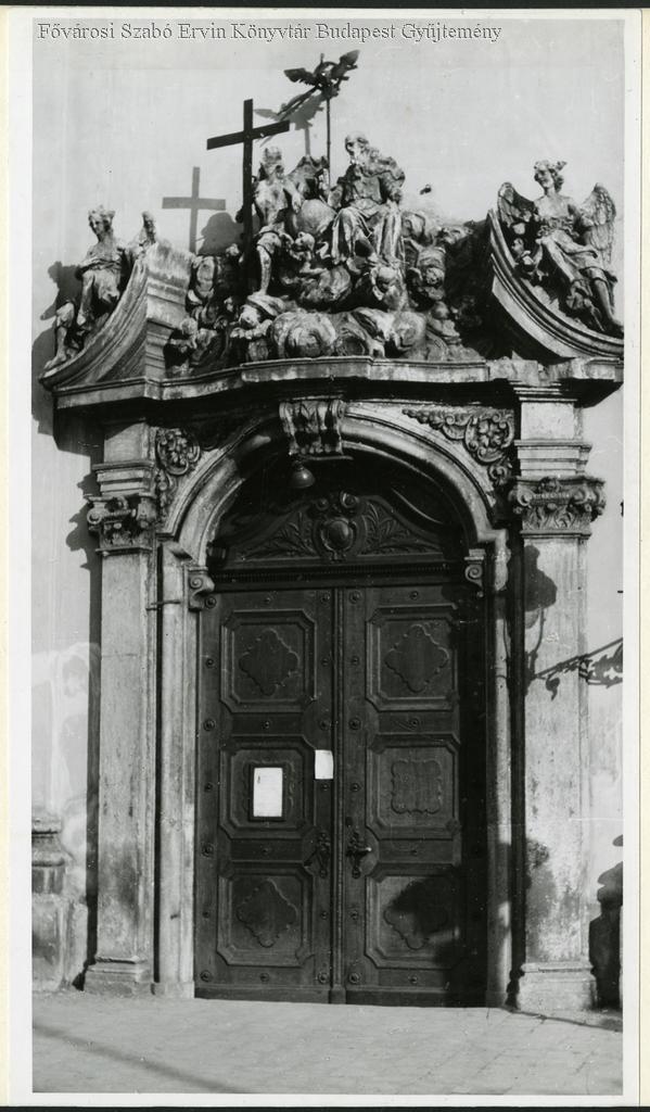 [A Belvárosi plébániatemplom főkapuja a Szentháromság szoborcsoporttal]