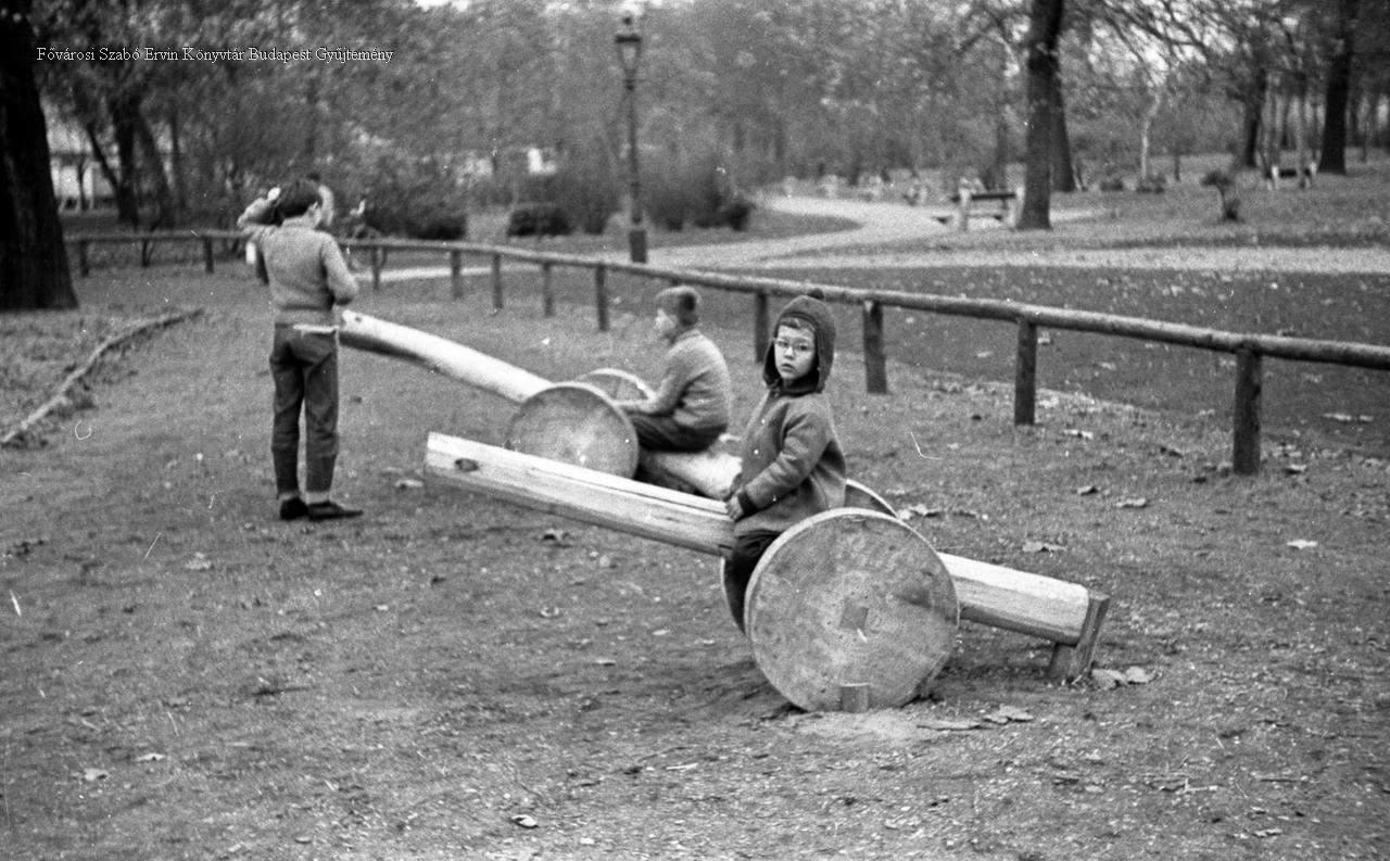 külső felvétel, park, játszótér, játék szabadban, gyermek, ember, játékszer, 1960-as évek