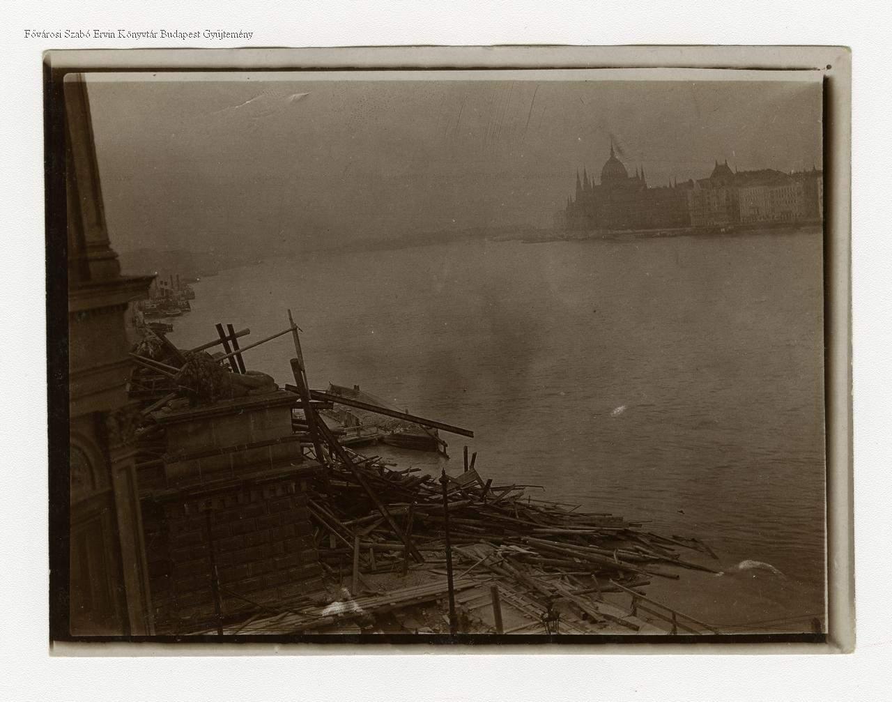Látkép a budai oldal felől, a híd egyik budai pillérével és az állványzat törmelékeivel. Háttérben az Országház épülete.