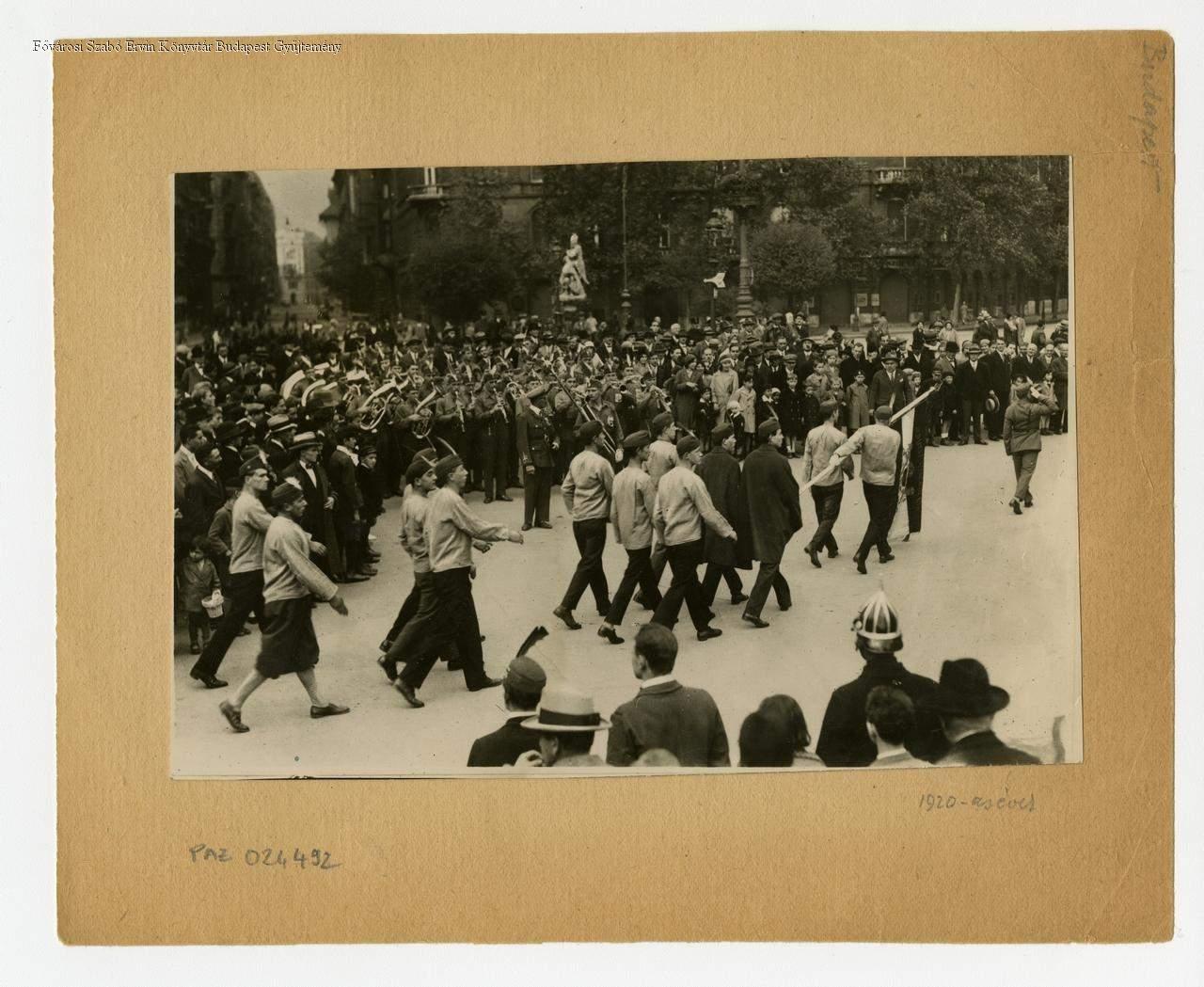 ünnepség, leventemozgalom, menetoszlop, zászló, fiatal, férfi, fiú, néptömeg, közönség, Horthy-korszak, 1920-qs évek