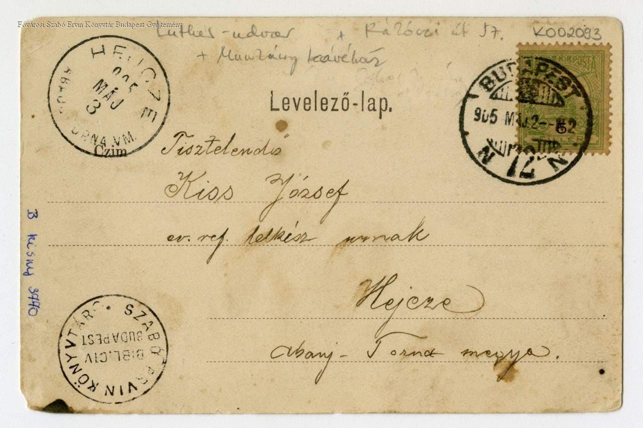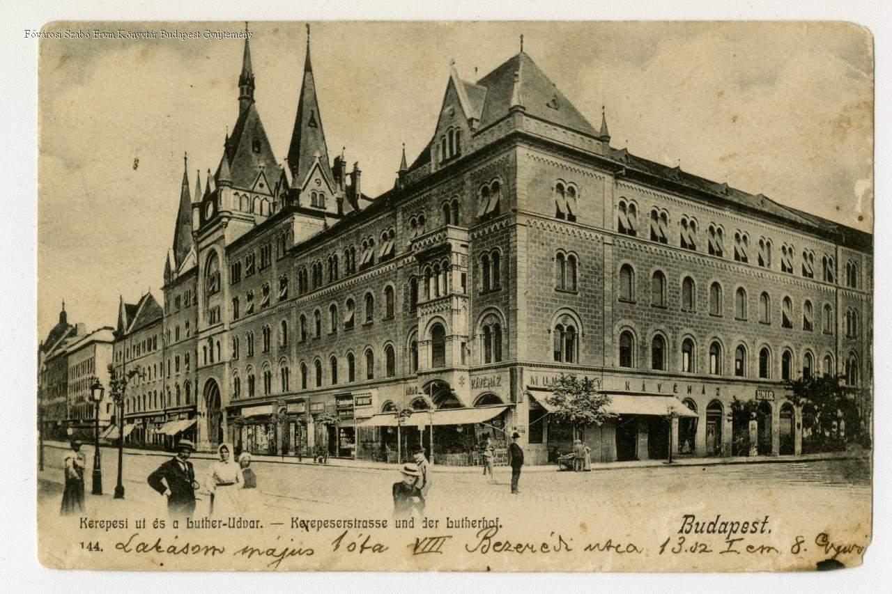 Balra a Kerepesi (ma Rákóczi) út látképe, középen a Luther udvar bejárata. Jobbra az Aggteleki (ma Kiss József) utca, szemben a sarkon a Munkácsy kávéház