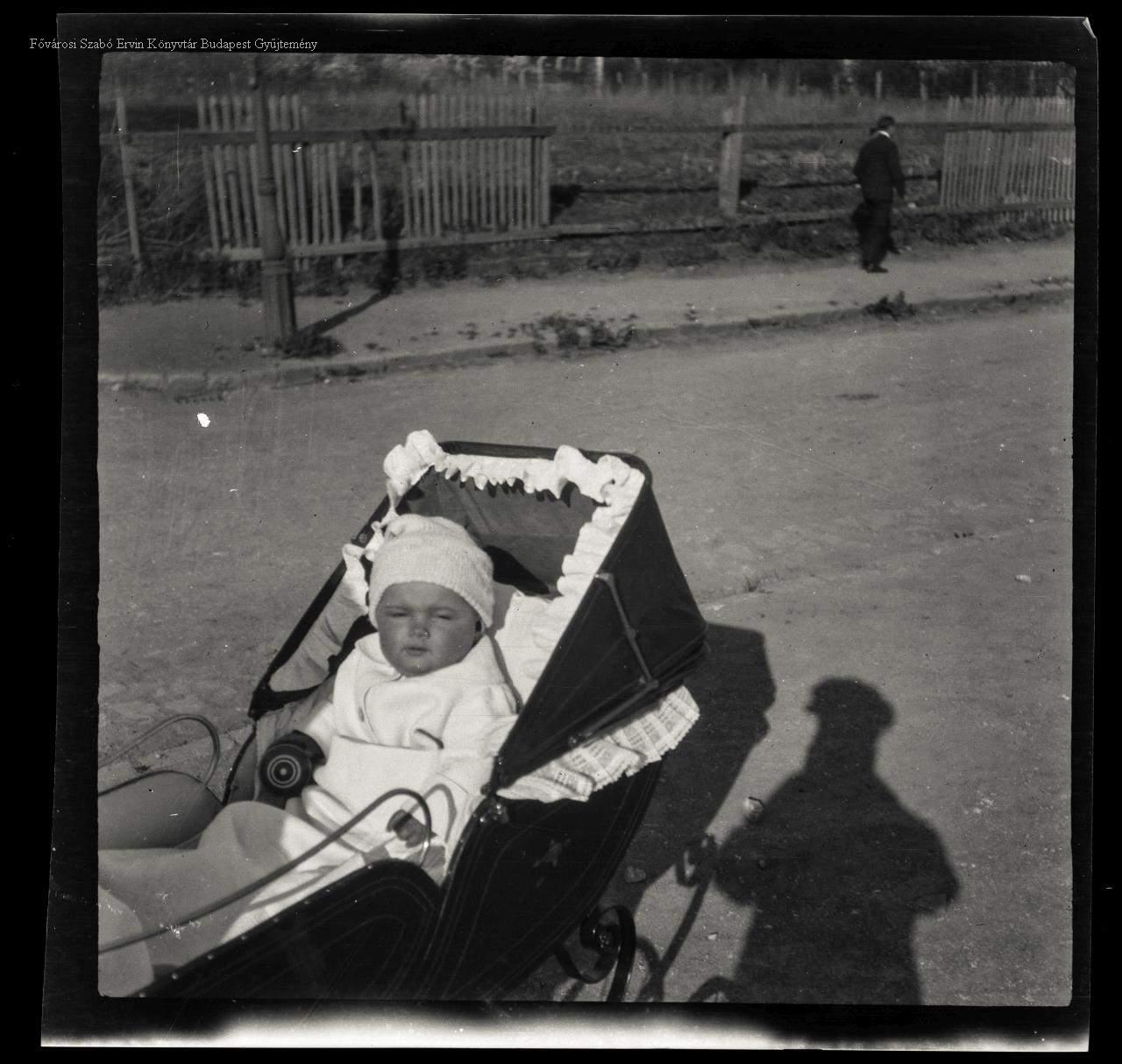 gyermek, babakocsi, utcakép, út, kerítés, férfi, árnyék