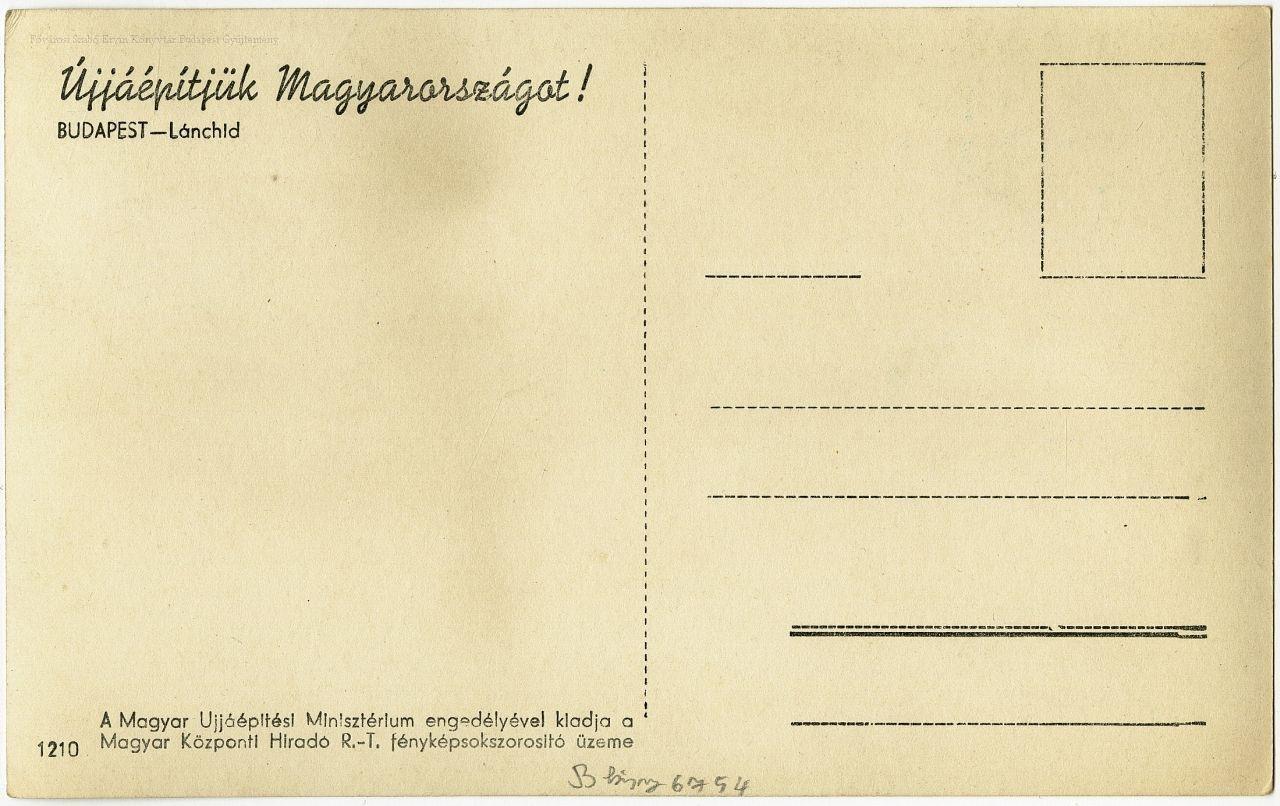 Kiadási adat a képeslapon: A Magyar Ujjáépítési Minisztérium engedélyével kiadja a Magyar Központi Híradó R.-T. fényképsokszorosító üzeme