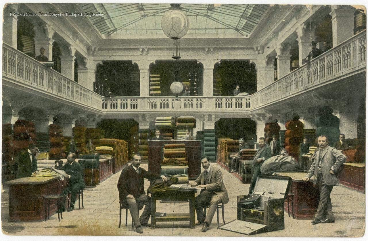 képes levelezőlap, belső felvétel, áruház, textiláru, férfi, ember, csillár, 1900-as évek