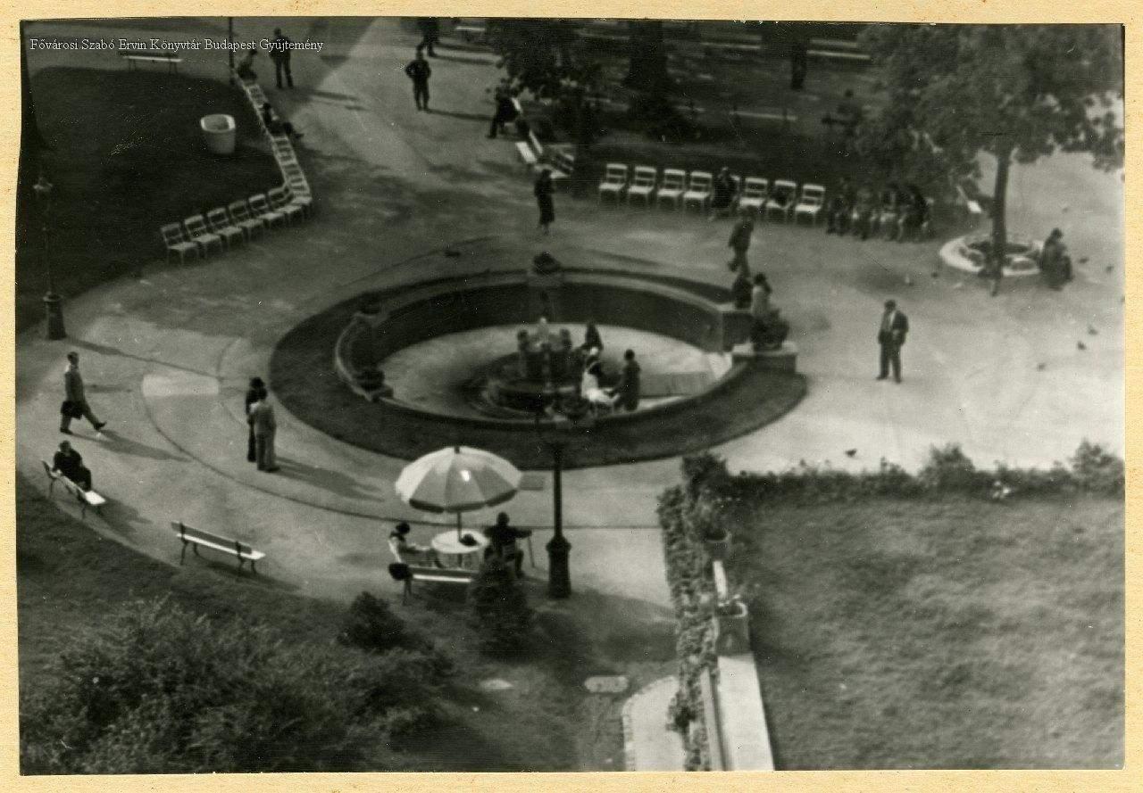 gyógyfürdő, gyógyítás, park, férfi, nő, ülőbútor, növényzet, díszkút, forrásvíz, gyógyvíz, napernyő
