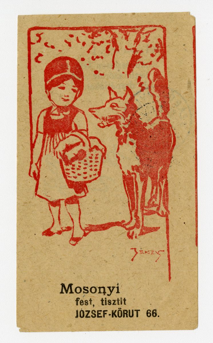 szőrmetisztítás, ruha, mosás, textilfestés, vegytisztítás, lány, Piroska és a farkas, mese, reklámnyomtatvány, kisnyomtatvány, aprónyomtatvány, számolócédula