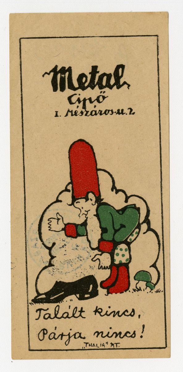 férfi cipő, lábbeli, cipész, férfi, üzlet, manó, törpe, reklámnyomtatvány, kisnyomtatvány, aprónyomtatvány, számolócédula