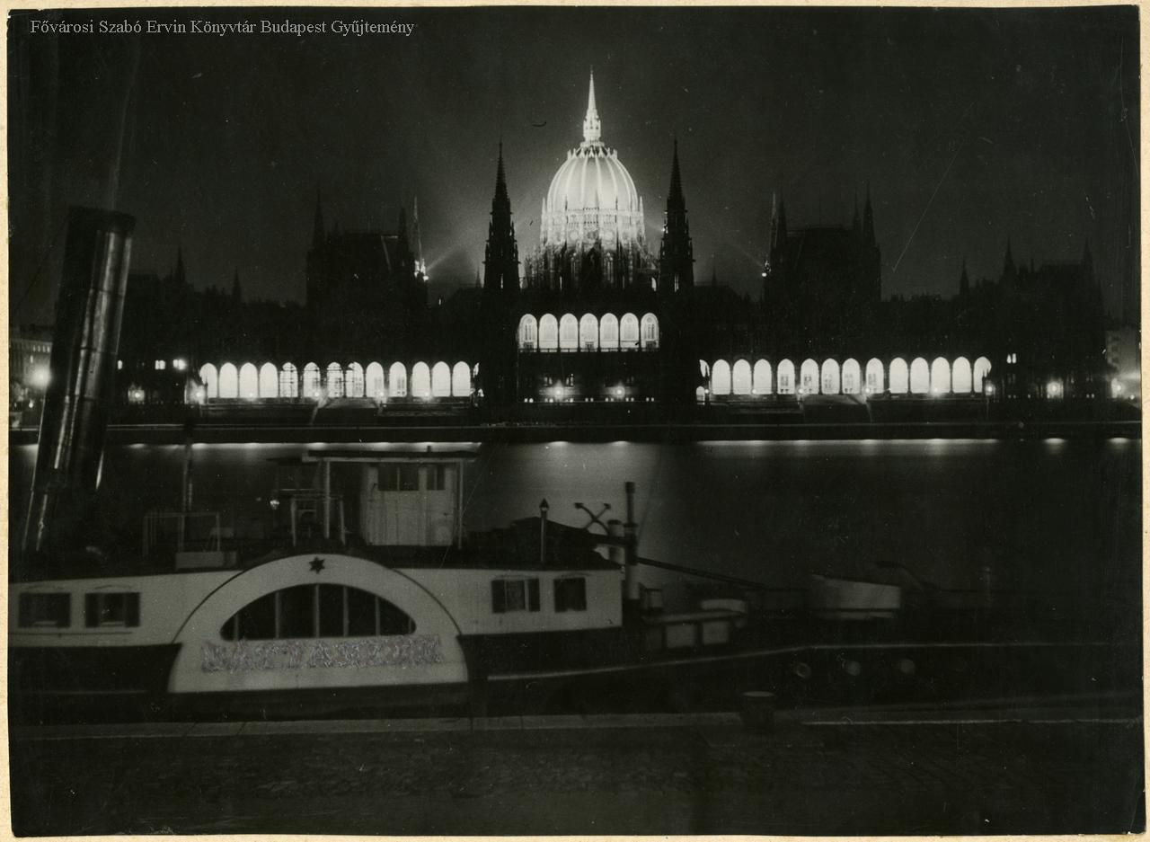 látkép, országház, hajó, kivilágítás, éjjel, 1940