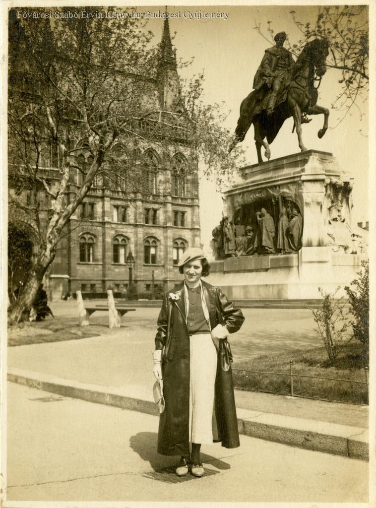 [Fiatal nő Andrássy Gyula gróf lovasszobra előtt, 1936.]