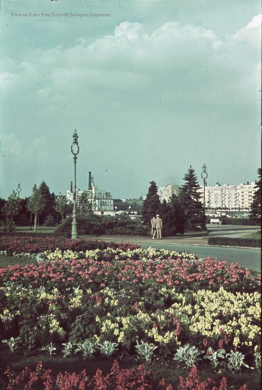 park, növényzet, fa, virág, lámpaoszlop, ember, lakóépület, épület, 1930-as évek