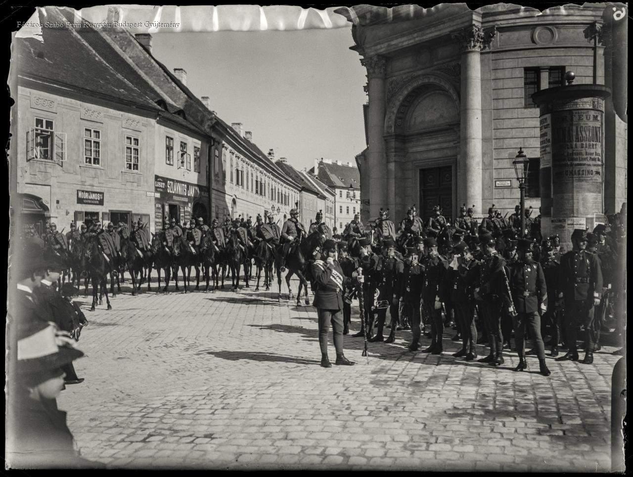 [Gyalogosok és lovas katonák várakoznak a Bécsi kapu téren] [Pedestrians and soldiers on horseback waiting at Bécsi kapu Square]