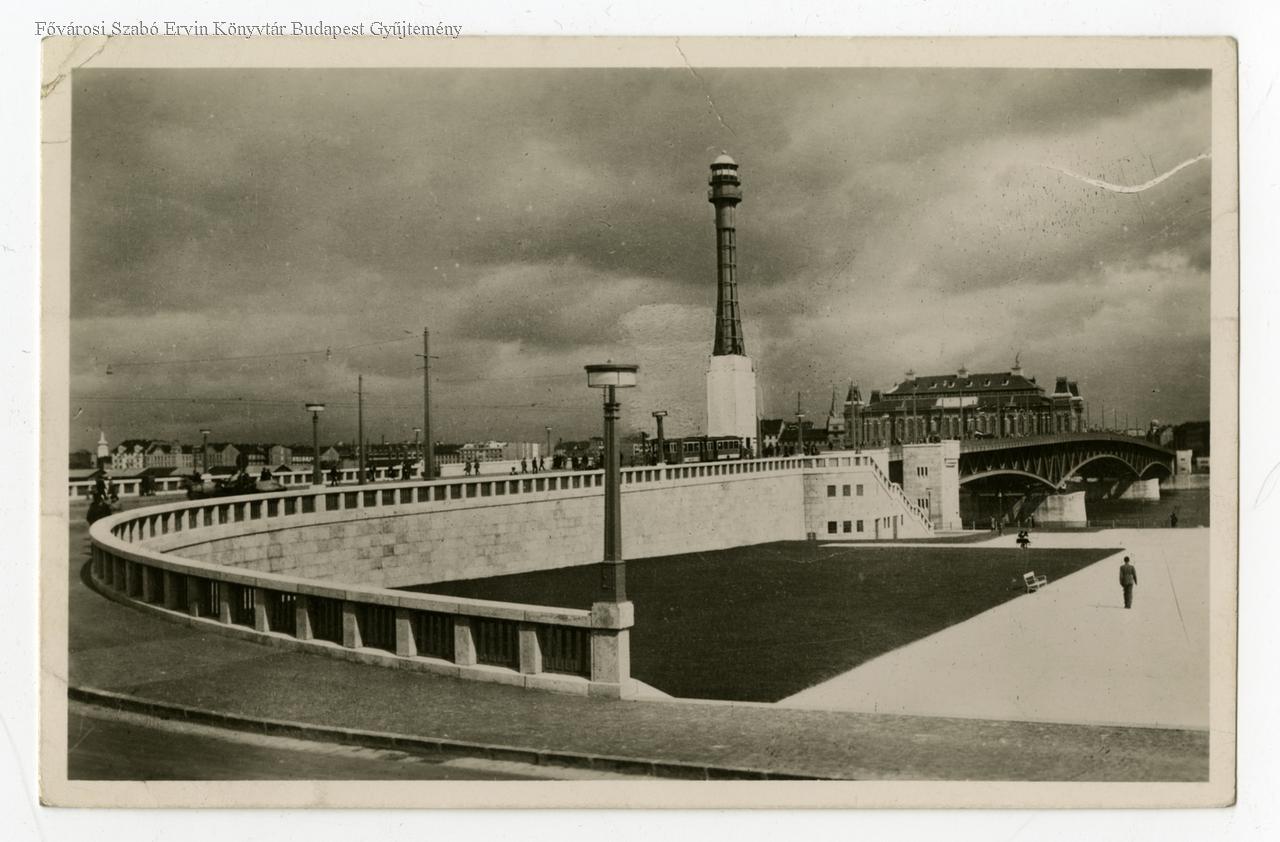 képes levelezőlap, híd, emlékmű, park, lámpa, villamos kocsi, 1940 körül