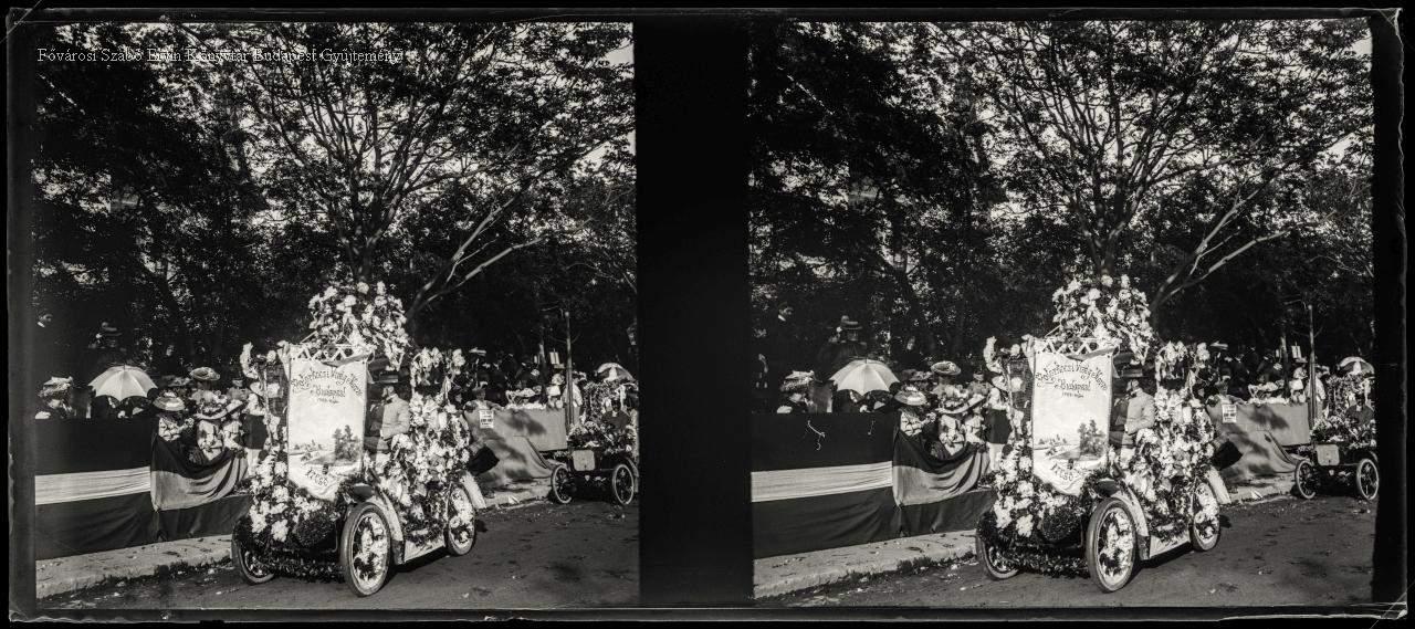 [Virágkorzó a Stefánia úton, az első helyezett automobillal] [Floral corso on Stefánia Road, with the first-prize-winning automobile]