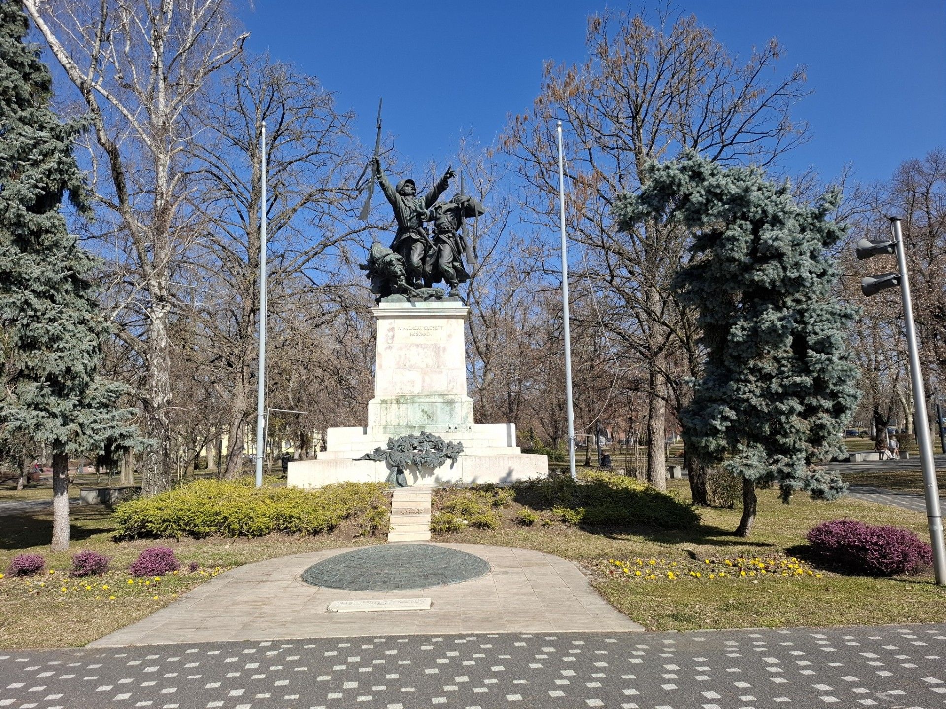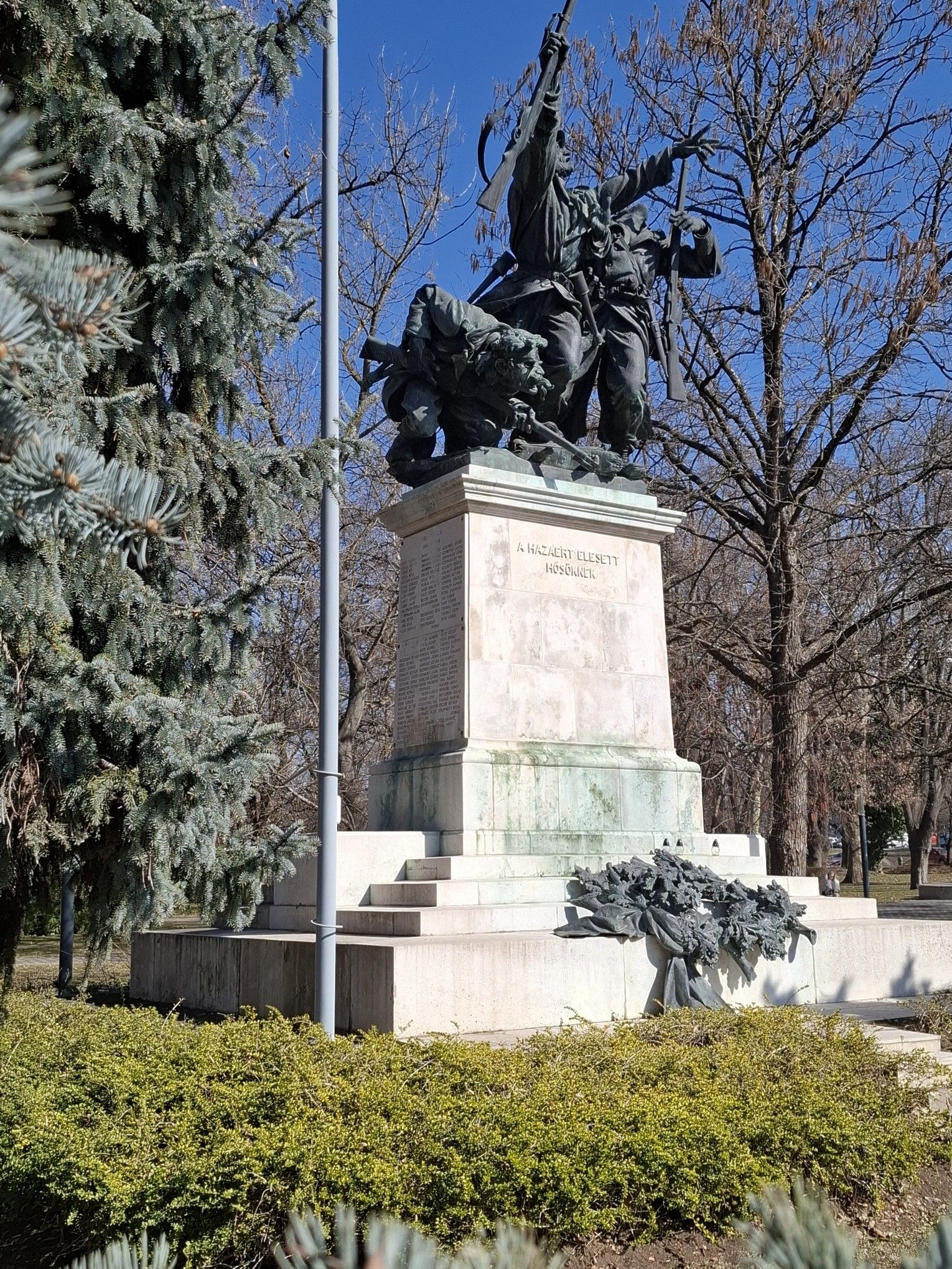 Visnyovszky hármas szoborcsoportja a katonákat a dicső halál pillanatában ábrázolja. A három, embernagyságúnál jóval nagyobb robosztus alak az elesett katona végsőkig kitartó küzdelmét jeleníti meg. Felirata: A hazáért elesett hősöknek.