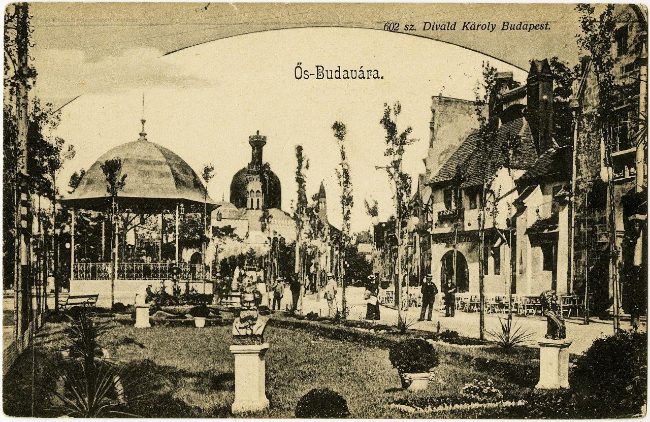 A képen park, körülötte pavilonok, háttérben a török mecset az ideiglenesen felállított vigalmi negyedben