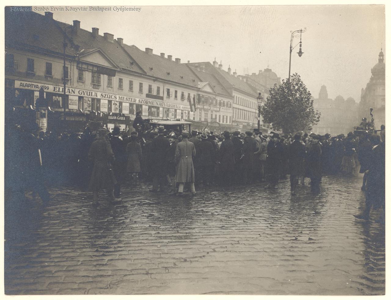 külső felvétel, 1918-as polgári demokratikus forradalom, utcakép, esernyő, gépkocsi, néptömeg, lámpa, üzlet, tábla, katona