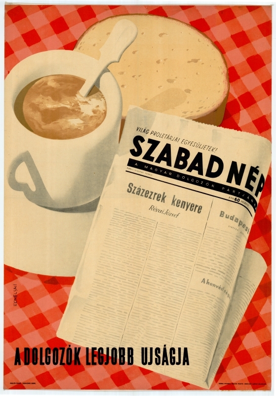 grafikus plakát, Szabad Nép, Révai József, Százezrek kenyere, Világ Proletárjai Egyesüljetek, Magyar Dolgozók Pártja (MDP), Dolgozók Legjobb Újsága, Konecsni György (1909 - 1970), reklámplakát