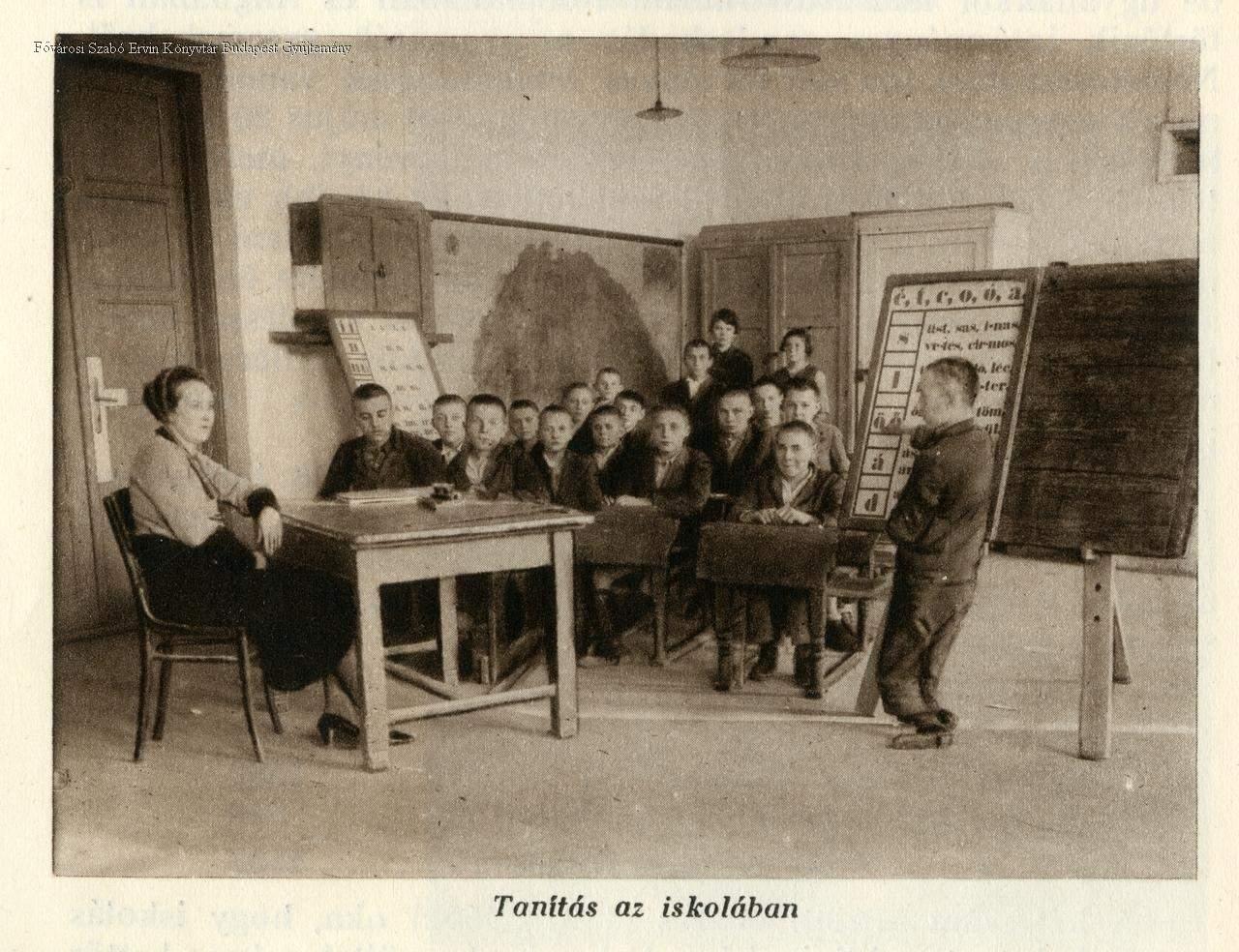 belső felvétel, nevelőotthon, mozgássérült, fiú, gyermek, pedagógus, tanárnő, tanuló, tanterem, iskolai térkép, szemléltető tábla, szociális gondoskodás, 1920-as évek, 1930-as évek