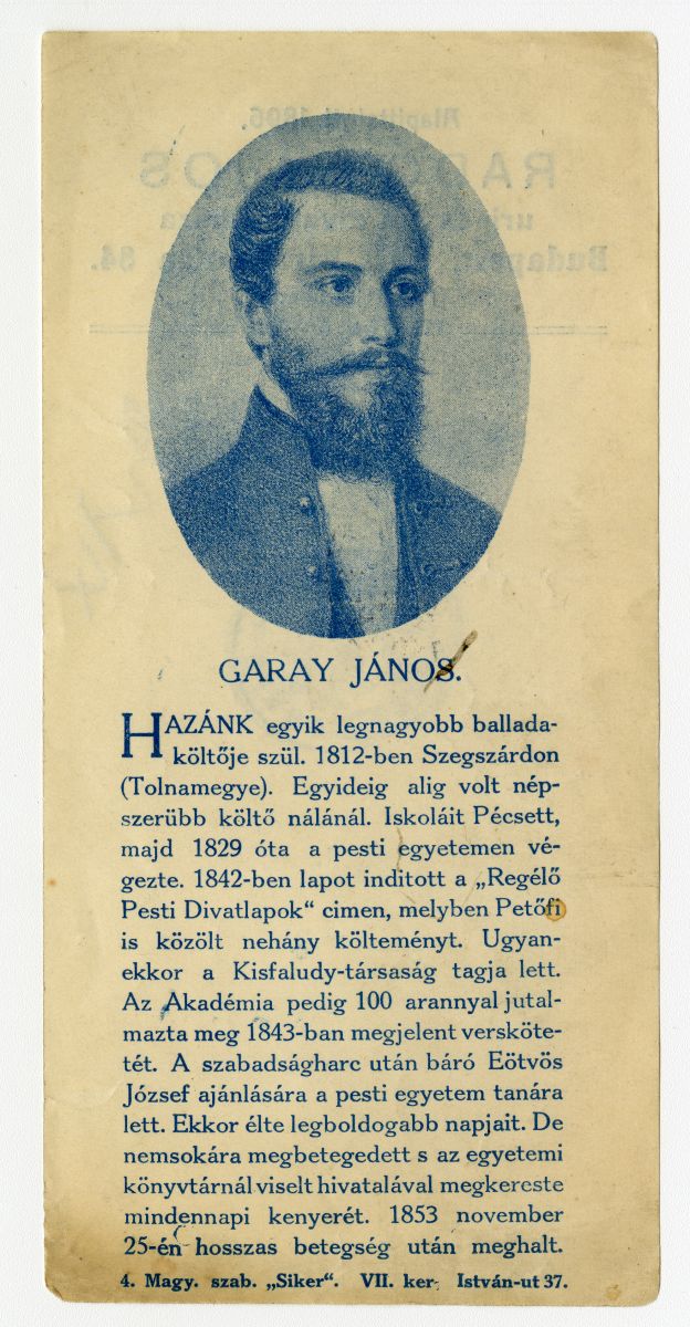 A hirdetés szövege: Hazánk egyik legnagyobb balladaköltője szül. 1812-ben Szekszárdon (Tolnamegye). (...) Regélő Pesti Divatlapok Magy. szab. "Siker".