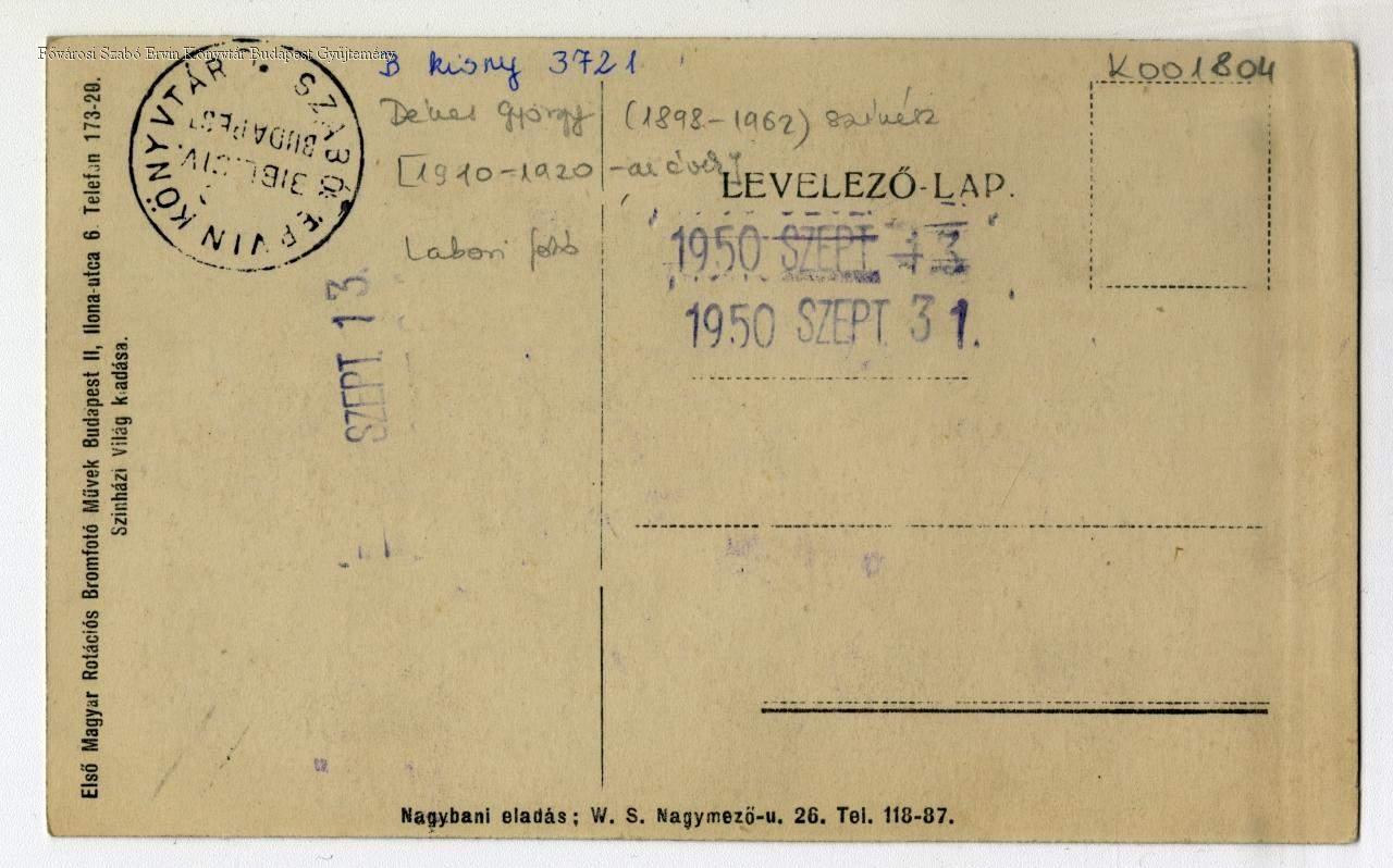 Kiadási adat a képeslap hátoldalán: Nagybani eladás; W. S. Nagymező-u. 26. Tel. 118-87