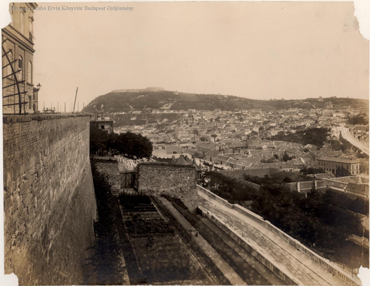 [Tabán látképe előtérben az épülő várfallal a Gellérthegy irányában]