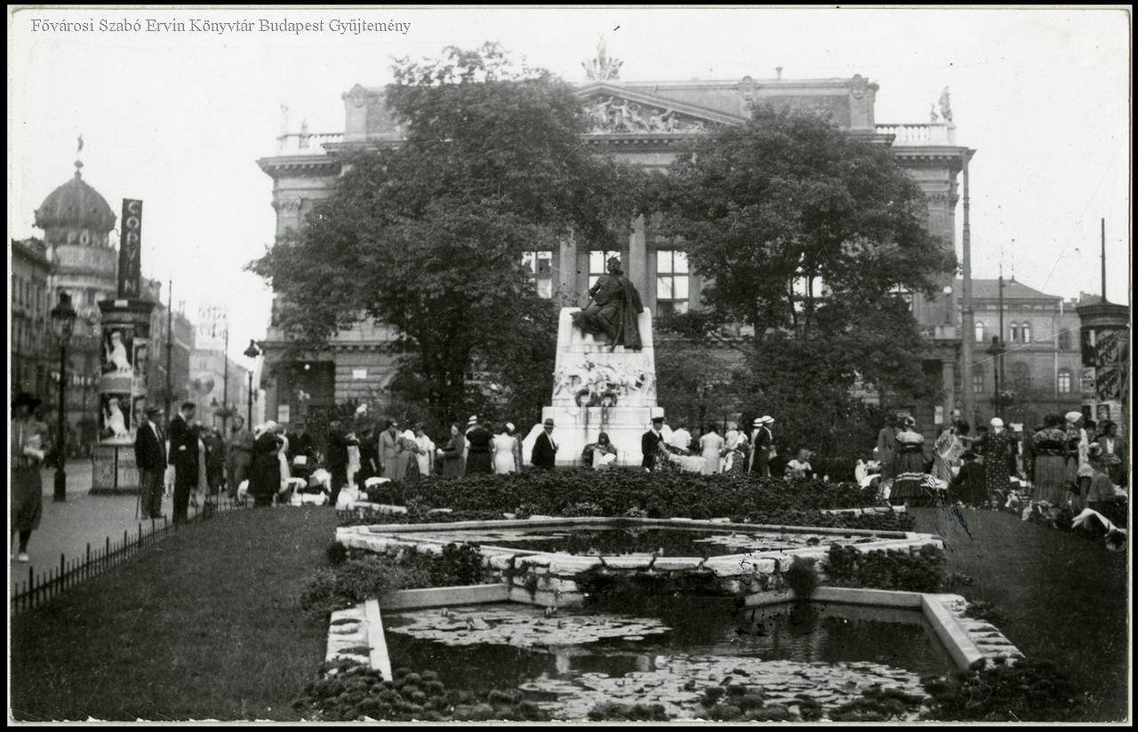 [Tinódi Lantos Sebestyén szobra a Nemzeti Színháznál, előtte árusok, park, díszmedence]