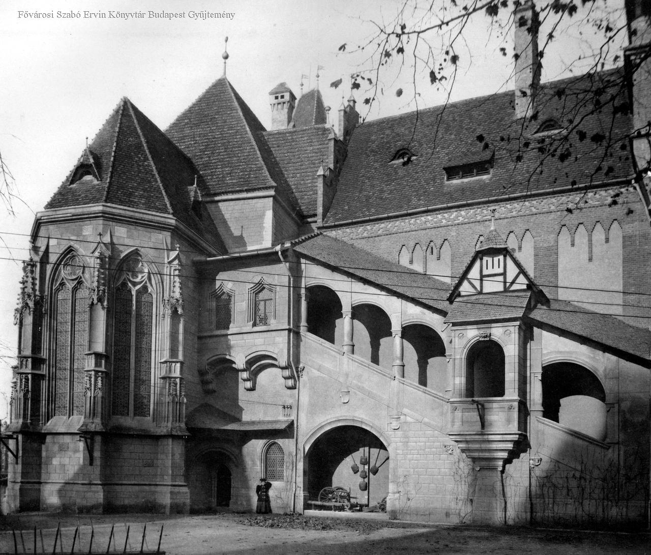 Történelmi kiállítás csúcsíves csoport: csütörtökhelyi kápolna és keresdi várlépcső, Arch. Alpár Ignácz, épitész Historische Ausstellung: gothische gruppe: Kapelle zu Csütörtökhely und offene Treppe des Castells zu Keresd /