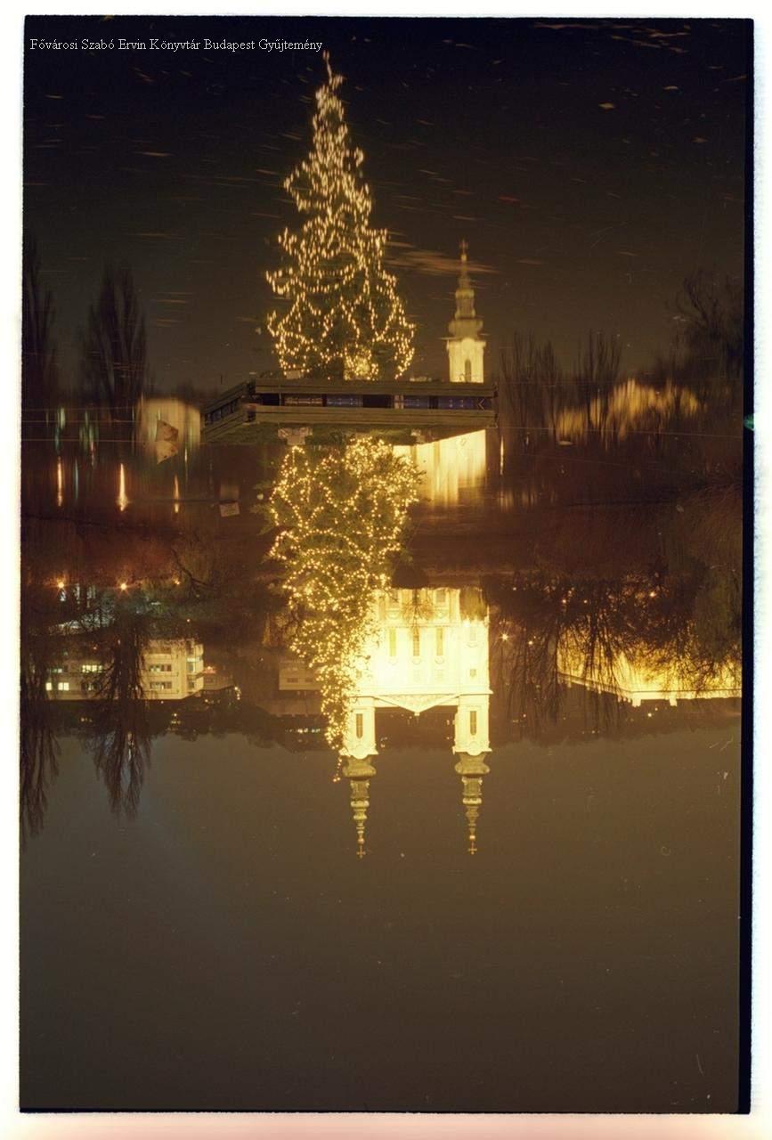 külső felvétel, tó, templom, kivilágítás, este, karácsony, karácsonyfa, 2000-es évek