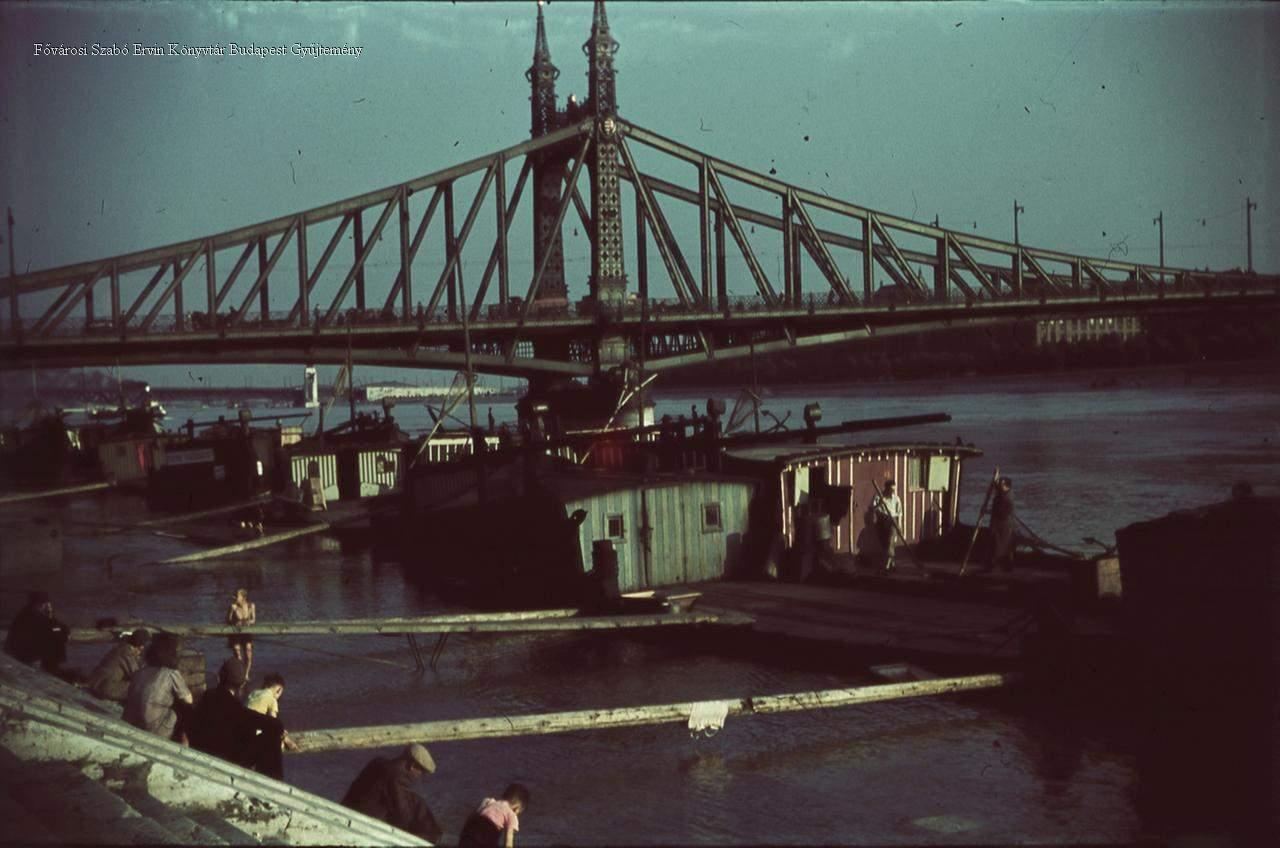 [Ferenc József (Szabadság) híd, előtérben halász-, haltároló bárkák]