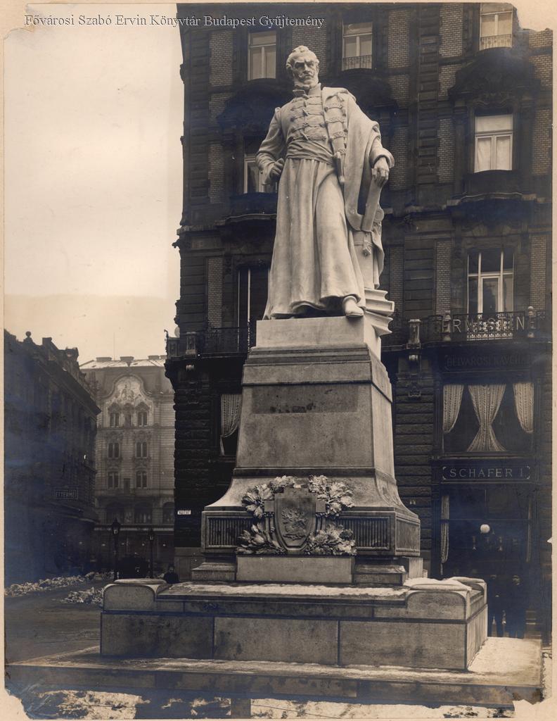 A szobrot a tér déli oldalán 1908-ban állították, 1948-ban lebontották. Mögötte a kávéházon Schafer felirat
