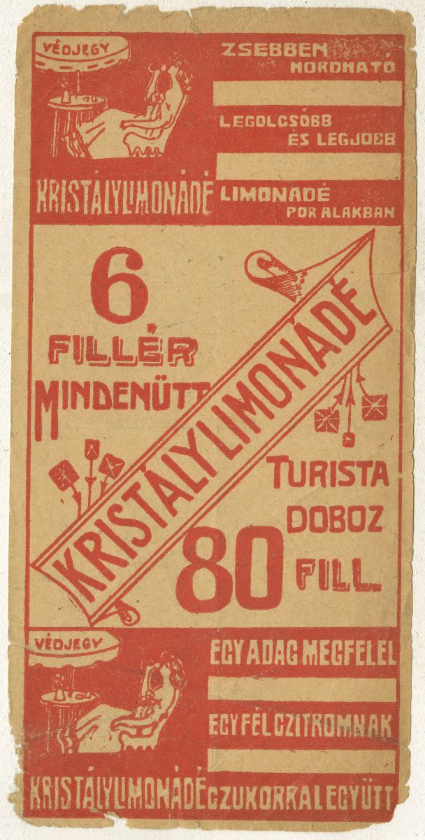 Védjegy. Zsebben hordható, legolcsóbb és legjobb, limonádé por alakban. Kristálylimonádé. Turista doboz 80 fill. 6 fillér mindenütt. Egy adag megfelel egy fél citromnak cukorral együtt.
