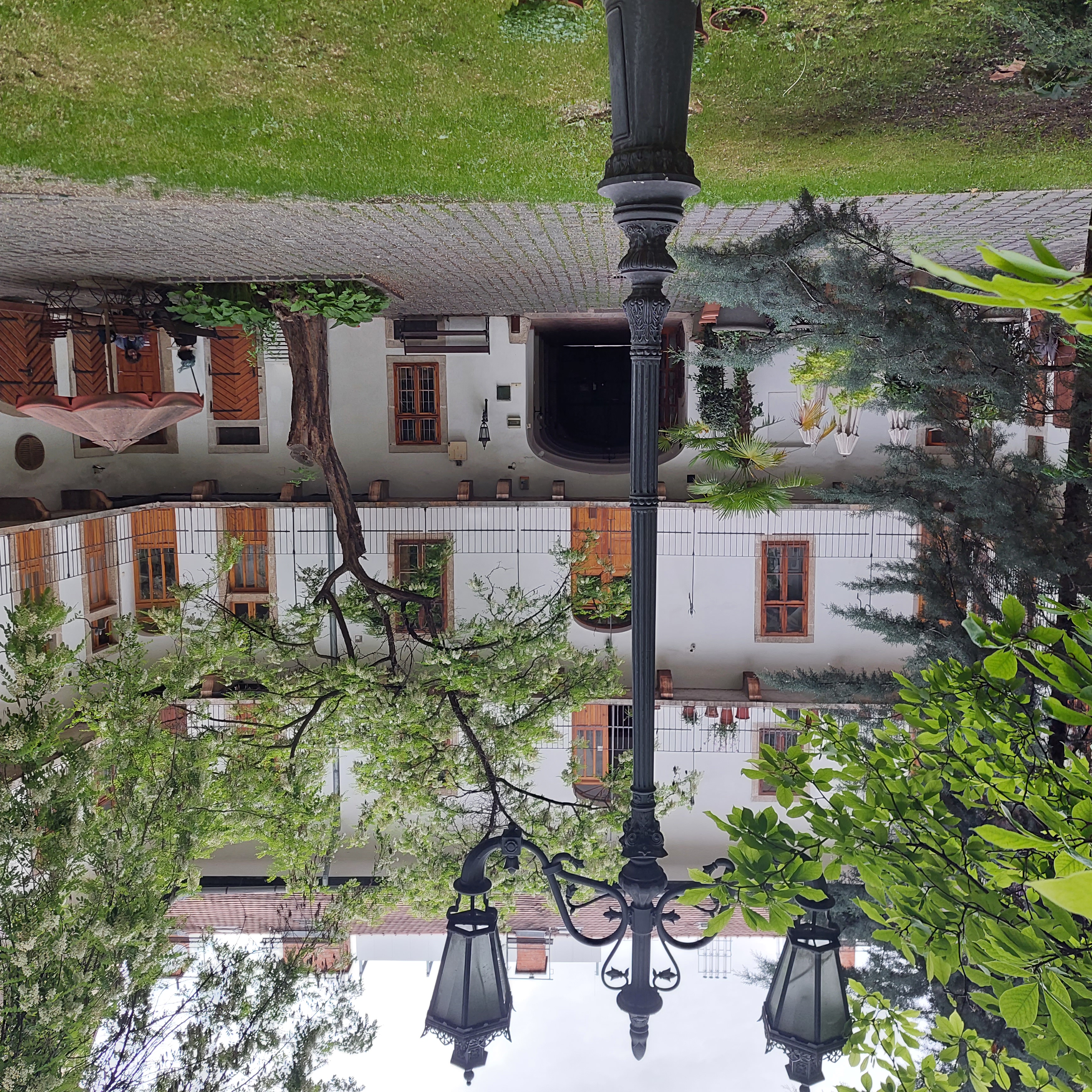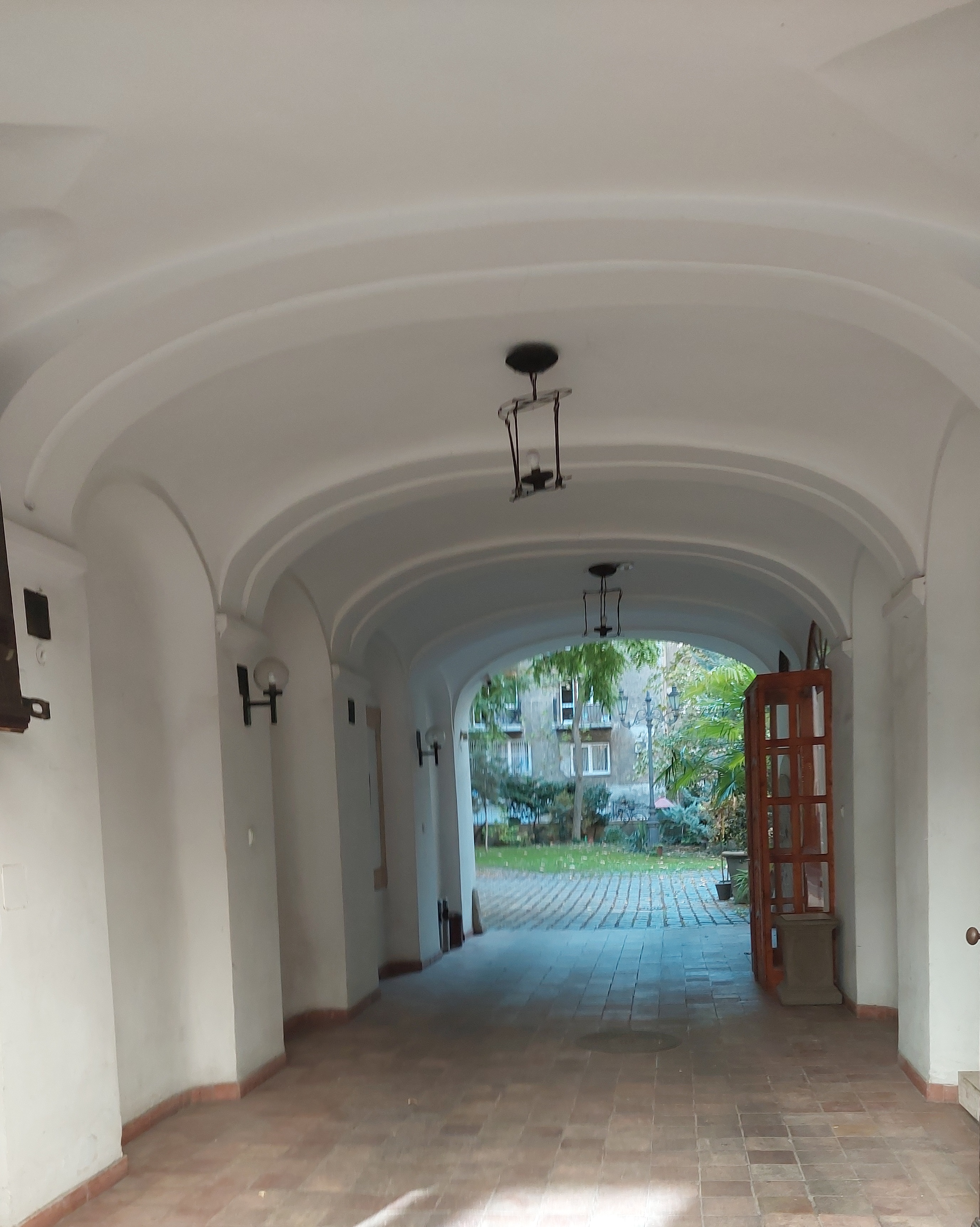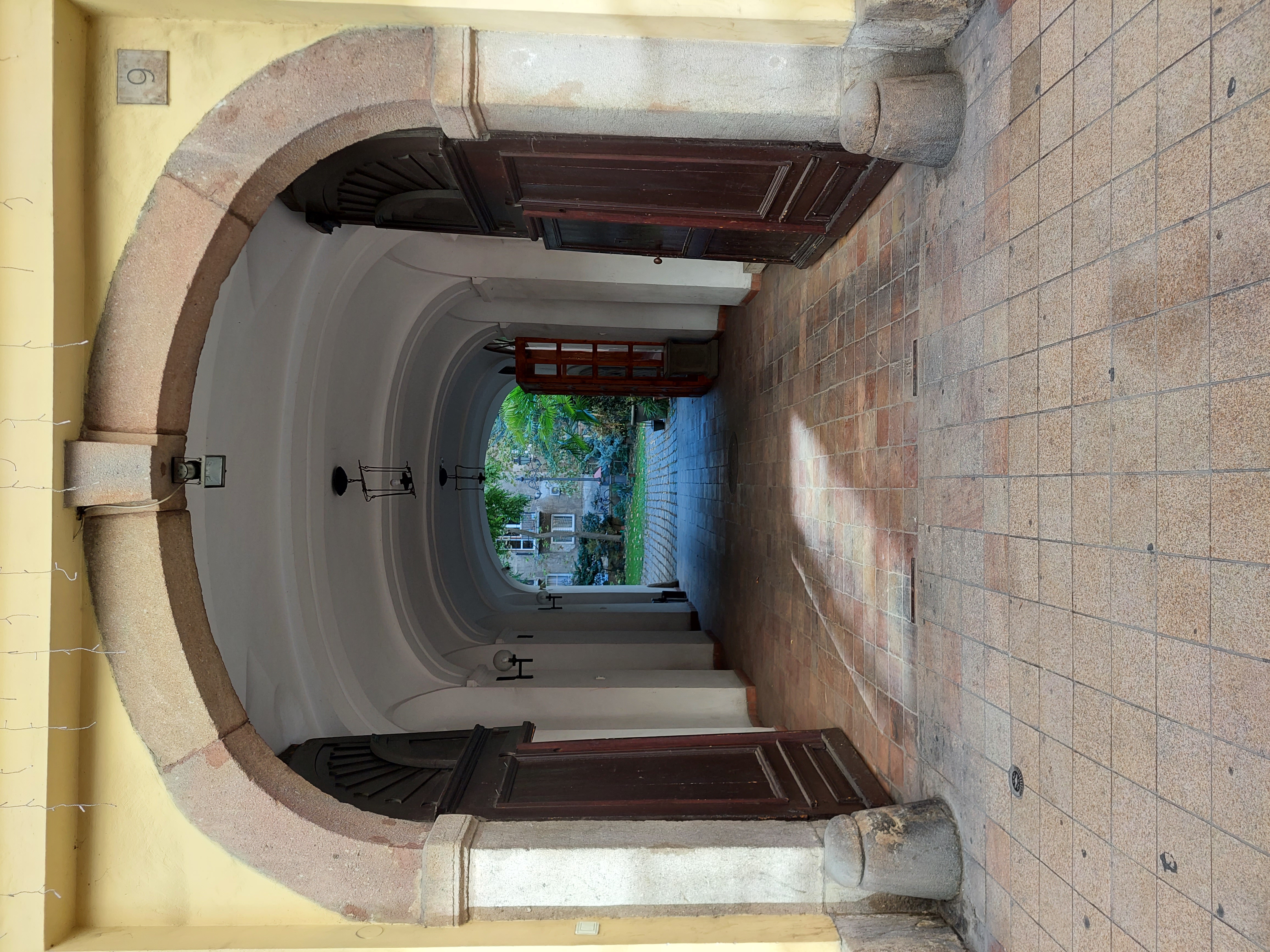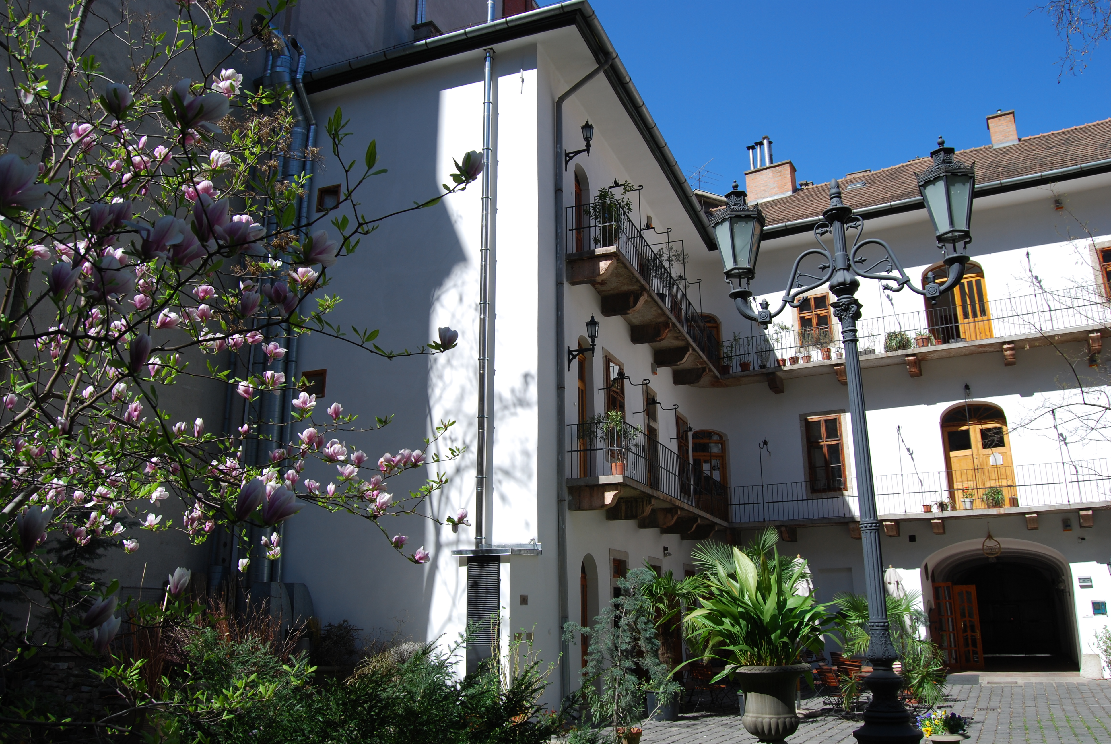 A ház udvari frontján a függőfolyosókat felújították, a hiányzó korlátelemeket az Október 6.-a utca 12. számú ház lebontásakor megőrzött korlátelemekkel pótolták. Az udvar egyik épületszárnyából nyílik a virágüzlet, a másik szárnyából az exluzív kávézó. Mindkettőben megtartottak a falkutatás során feltárt eredeti falrészletekből. A virágüzlet egy mediterrán kertet idéz illataival, fényeivel és a benne pompázó virágokkal. A másik üzlet több mint kávézó, eleganciája intimitása és az eredeti értékek megőrzése méltán illeszkedik az épület szépségéhez. Bezárás után míves vastáblák zárják el a belátást az avatatlan szemek elől.