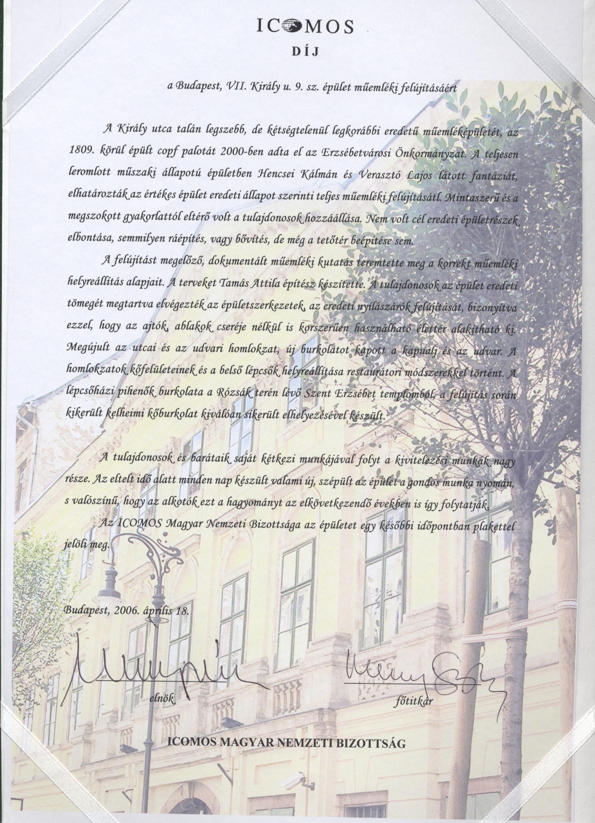 A Ráday Mihály nevével fémjelzett városvédő mozgalom aktivistái és a műemlékvédelem iránt elkötelezett fiatalok megmentették az épületet a teljes pusztulástól. A VII.kerületi Önkormányzat eladta az épületet — tudomásom szerint azzal a feltétellel — hogy az épület teljes felújítását el kell a tulajdonosoknak végezni és az eredeti állapotot kell helyreállítani.