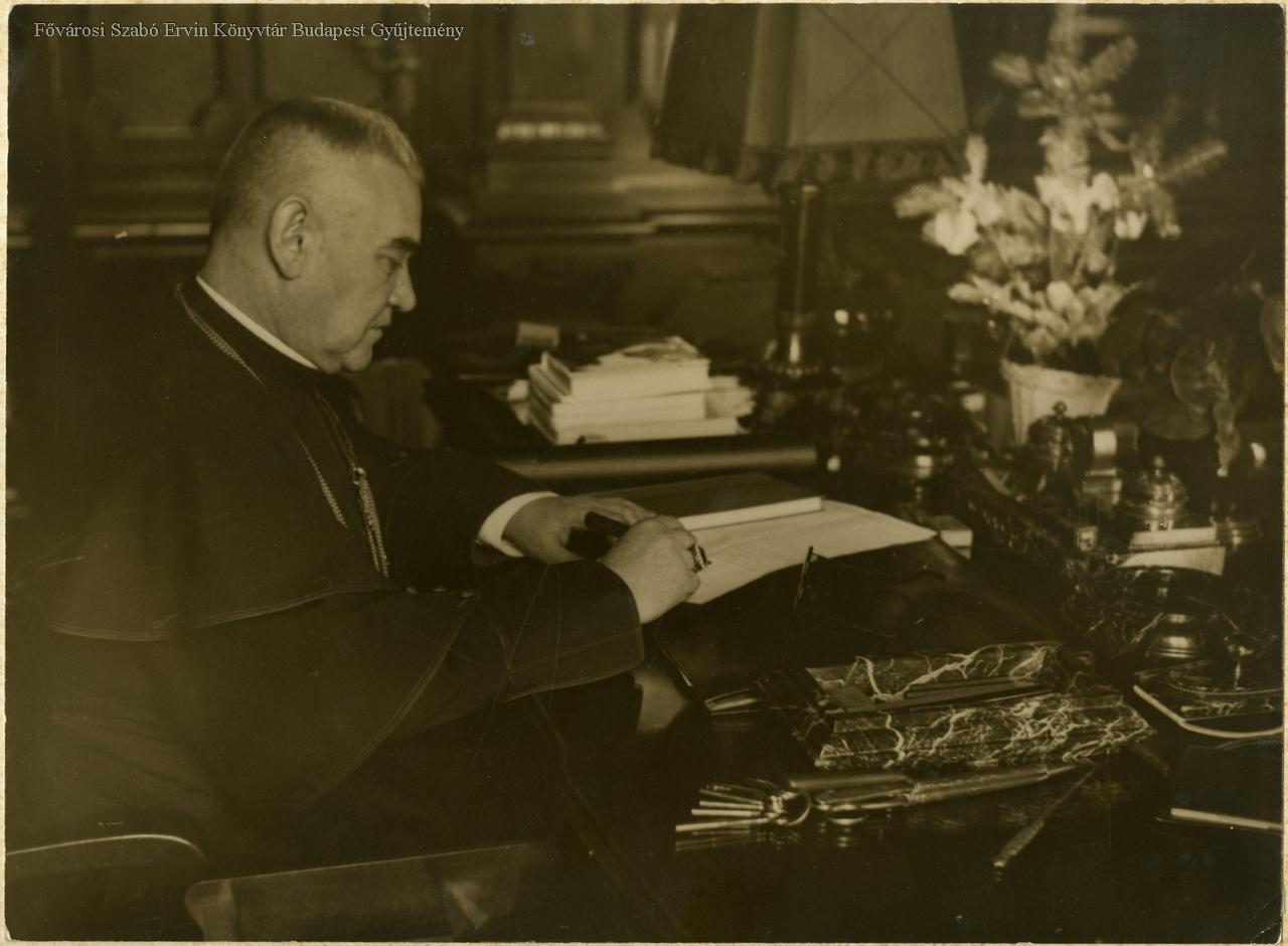főpap, katolikus pap, politikus, miniszter, népjóléti minisztérium, egyházi ruházat, íróasztal, 1920-as évek