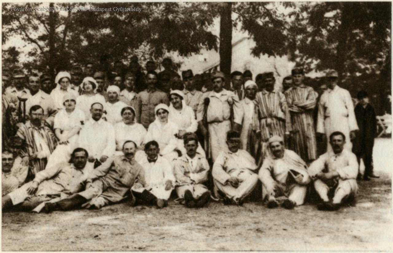 külső felvétel, első világháború, háborús sebesült, katona, kórház, betegápoló, ápolónő, csoportkép, 1914-1917
