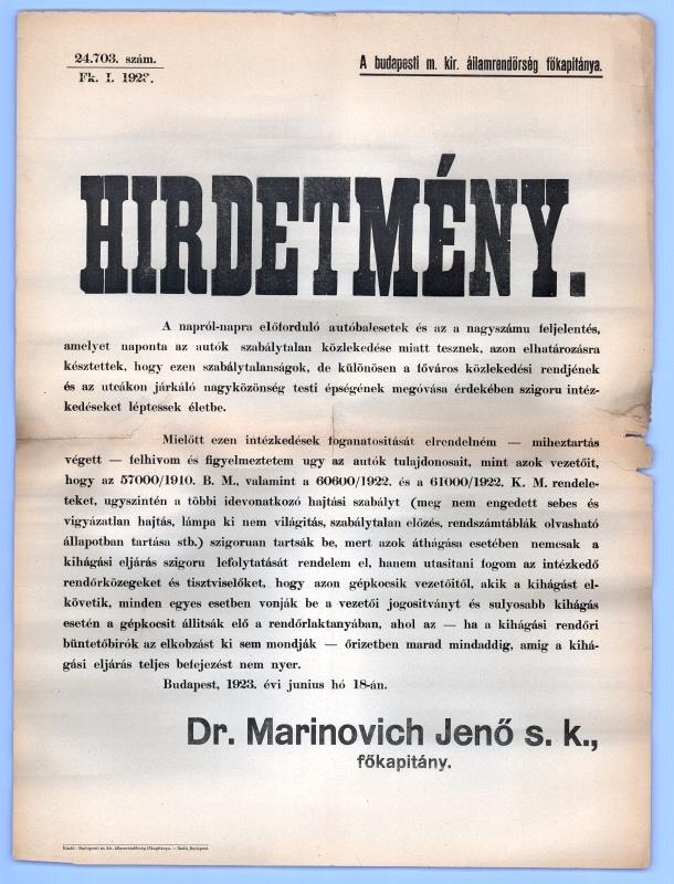 hirdetmény, főkapitány, államrendőrség, közlekedési kihágások, közlekedés, 1927, rendőrség, gépkocsi, vezetői engedély, 57000/1910. B. M. rendelet, 60600/1922. K. M. rendelet, 61000/1922. K. M. rendelet, Marinovich Jenő főkapitány, 1923. június 18., Budapest, 24703 szám, rendőri őrség, Budapesti Magyar Királyi Államrendőrség,