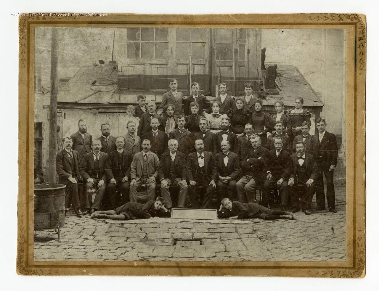 [Budapesti Kefekötő Egylet tagjainak csoportképe egy ház udvarán]